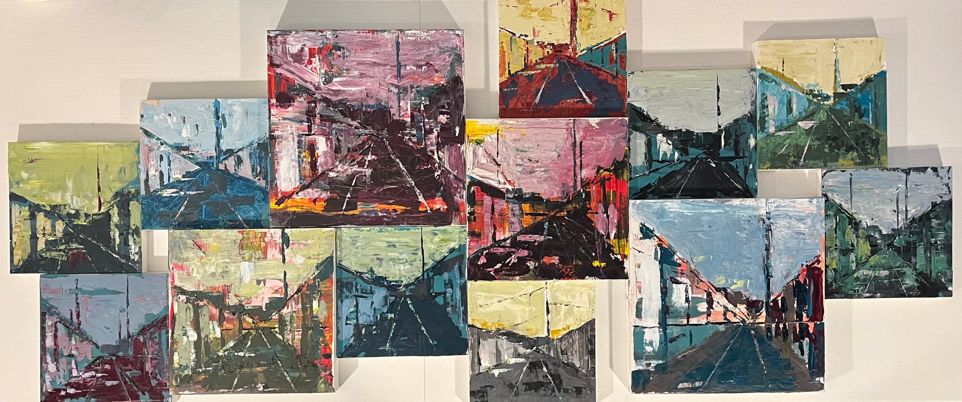 This piece is created as an assemblage of thirteen attached cradled wood panels depicting abstracted alley way scenes, painted in oil with a palette knife.
