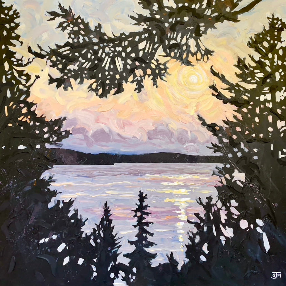"After the Storm" is an acrylic painting capturing the tranquil aftermath of a storm at sunrise. The sky, tinged with soft pastel shades of pink, yellow, and lavender, is partially obscured by dark silhouettes of pine trees. These trees frame a calm lake, where the emerging light reflects off the water's surface. The composition conveys a peaceful, reflective mood, highlighting the serene beauty that follows the intensity of a storm.