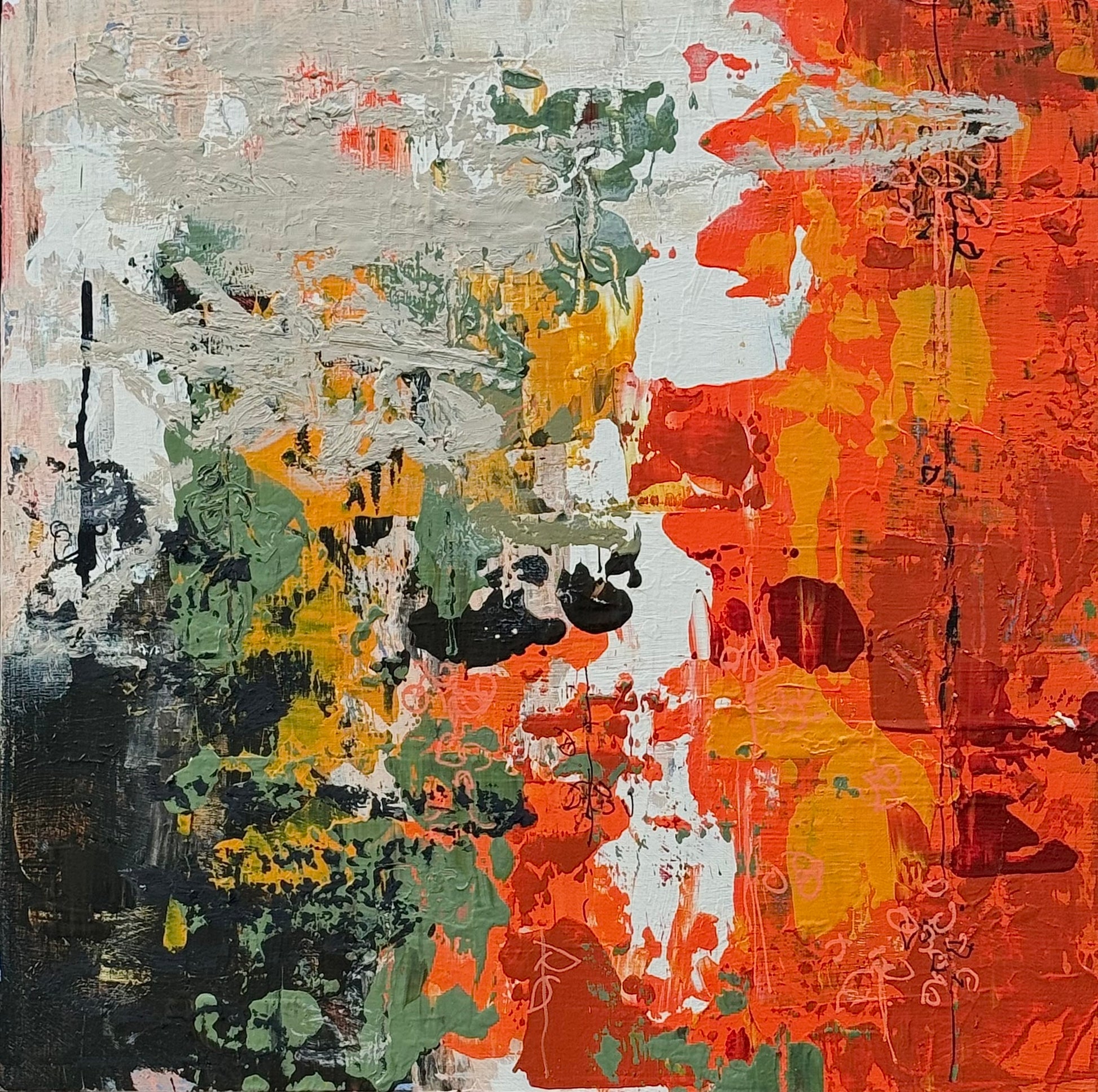 This painting, one of a series of three, is inspired by the changing season of Canada's landscape: the remarkable fall colours our forests offer, and the richness of their offerings. My view is one of abstraction, allowing the viewer to enjoy an interpretation of their own.