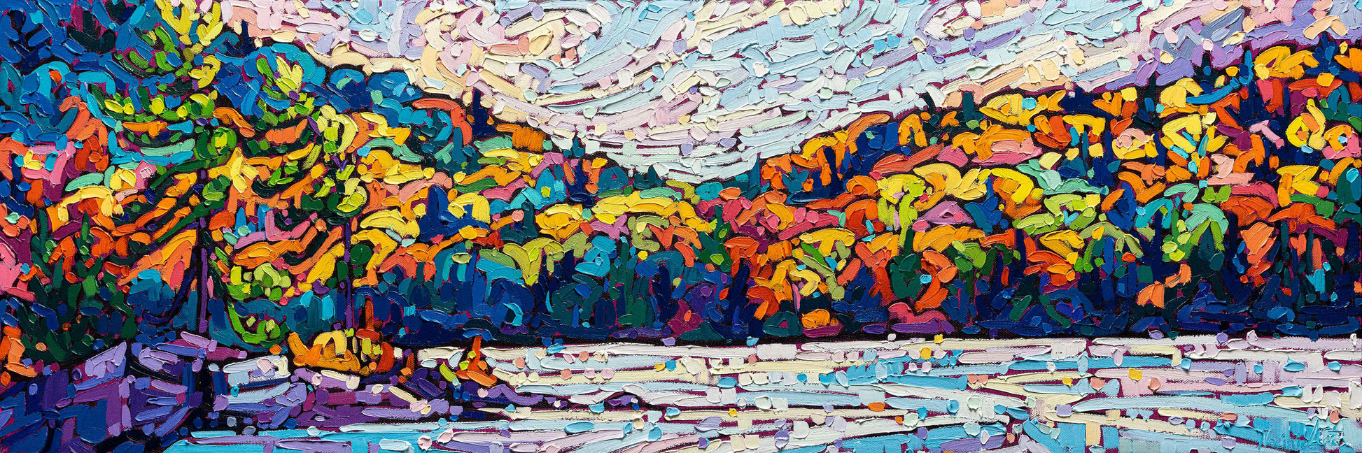 This small oil painting is a jewel. It brings in the symphony of our autumn colours with texture from the thickly applied oil paints. The sides of the canvas are painted black.