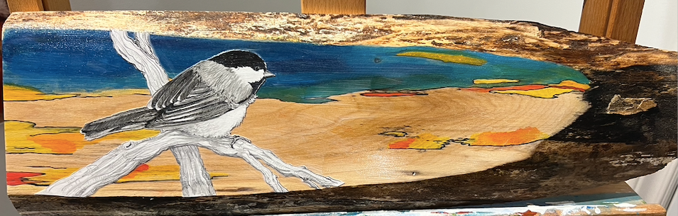 Medium: Acrylic Painting and Drawing of Chickadee on Maple Wood