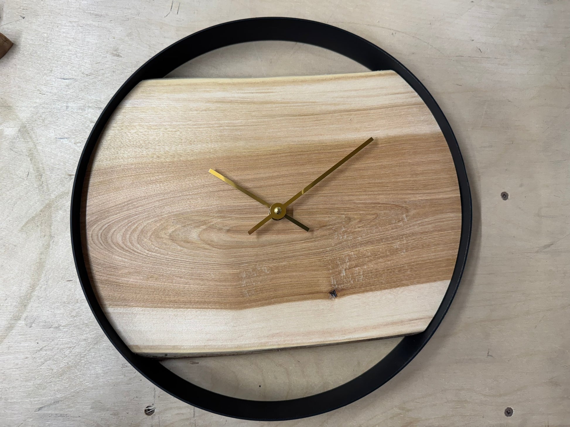 Hand made from birch hardwood cut and milled on our property, the steel frame is rolled in our shop and the clock face is custom cut to fit that frame. The wood is sealed with a hardwax oil and a quartz clock movement installed.