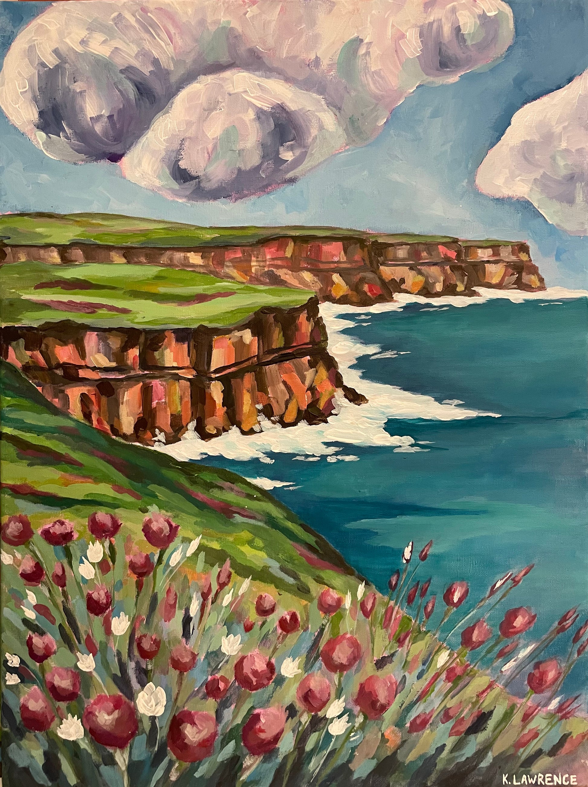 Blooming Heather is a vibrant celebration of Ireland’s iconic Cliffs of Moher. The painting showcases the symbolic heather in full bloom across the foreground, framing the majestic cliffs that rise above the rich blue-green waters below. Waves crash against the shore, bringing movement and life to this timeless coastal scene.