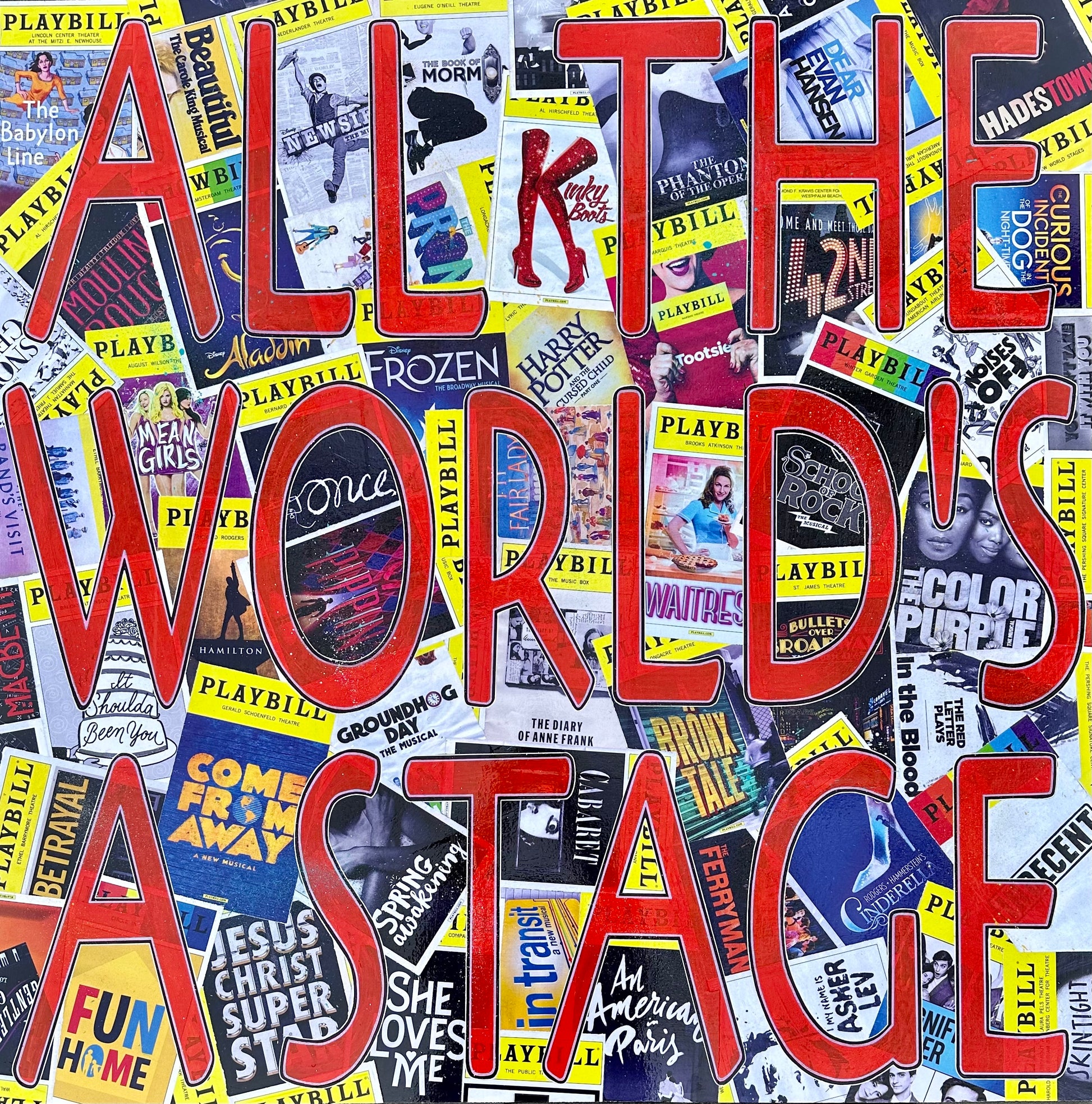Broadway Baby is a 40" x 40" mixed media painting on wood panel. The background is a collage of a multitude of playbills from Broadway shows.You can count how many you've seen and count how many you want to see.“All The World's a Stage” is an excerpt taken from Shakespeare's play, 'As You Like It'. It is the perfect phrase to intertwine with the collage. The overlay is done in acrylic paint.