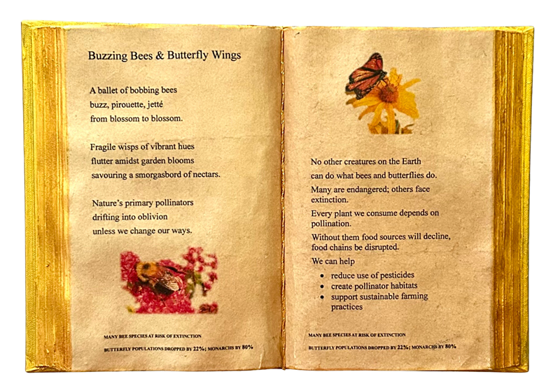 Medium: Recycled Book, aged paper, fabric remnants, resin, tassle, original prose. Designed to be hung