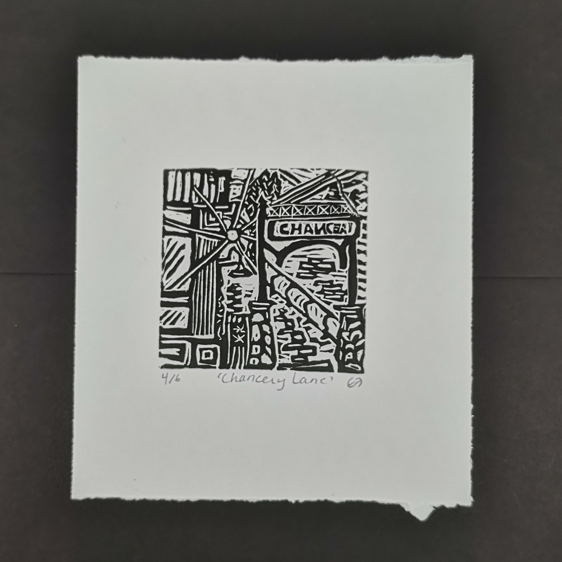 This unframed Linocut Print fits into a matted 8 x 8 inch frame. The block measures 3.25 squared printed on paper roughly 6 x 6.5 inches. Chancery Lane is a sweet alley in Bracebridge full of little shops and galleries. The sign and stone work reminds one of Europe.