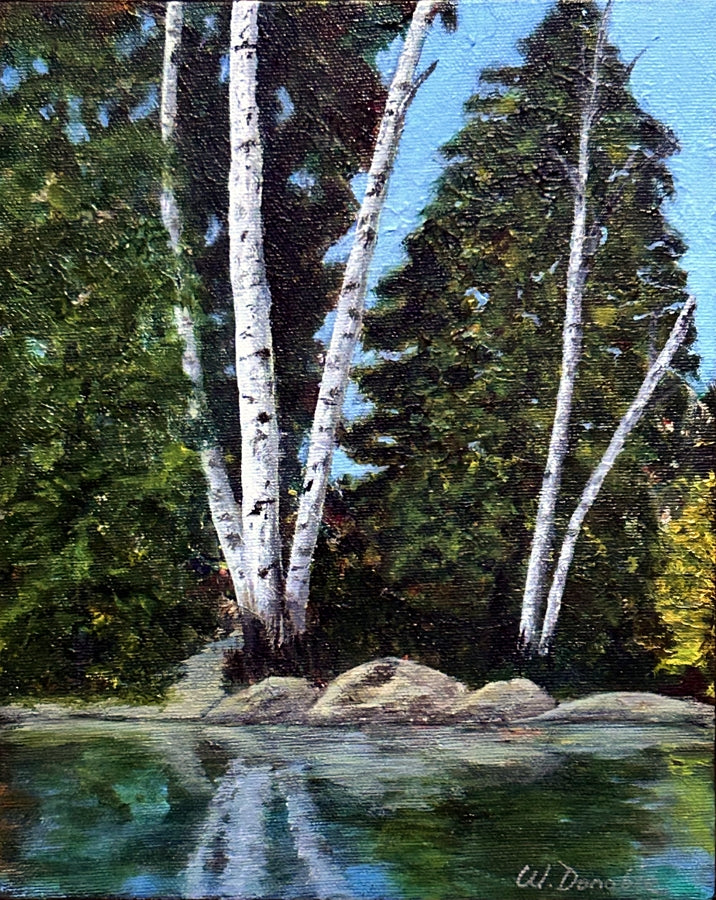 A familiar Muskoka scene. The stark white beauty of birch trees set against a background of rich greens and a crisp blue sky with the ripples of reflection in the water creates a harmonious composition and captures the serenity and grace of the scene – a timeless connection between land, water and sky.