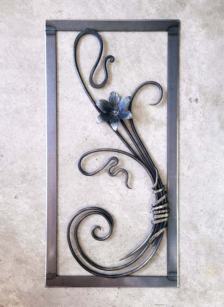 Our "Everlast" series of hand-forged metal wall artworks feature detailed hand-forged flowers and custom designed scrollwork set against an open concept linear frame. These sculptures are part of our "Three Sisters" series of designs, a unique body of work which began in 2023 and includes the Everlast series, the Antiquity series, and the youngest 'sister' Eternity.