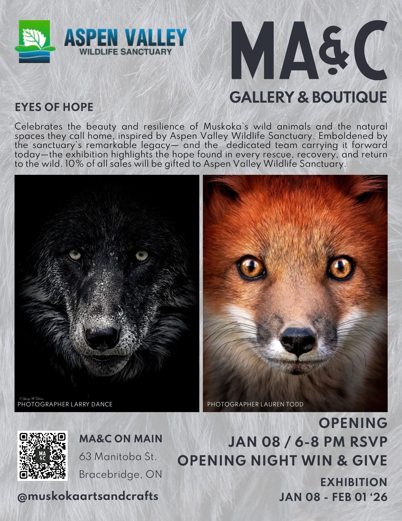 Celebrate the beauty and resilience of Muskoka’s wild animals and the natural spaces they call home, in an exhibition inspired by the remarkable work of Aspen Valley Wildlife Sanctuary. Emboldened by the sanctuary’s legacy—and the dedicated team carrying it forward today—this show highlights the hope found in every rescue, recovery, and return to the wild.