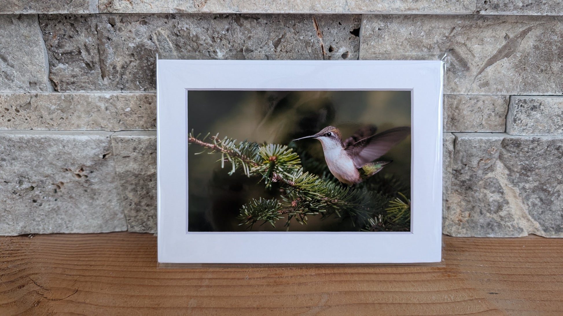 This photograph of a ruby-throated hummingbird was taken at our cottage on Deer Lake near Sundridge, Ontario. The hummingbirds love our feeders at the cottage, and they provide some great opportunities for photography too. This was one of many females coming to feed that day. They tend to perch in our evergreens, swoop in for a drink, and head back to rest in the evergreens before zooming back in for more food - repeating this process over and over. This shot was taken just as she was about to leave her resting spot to come in for another drink.
