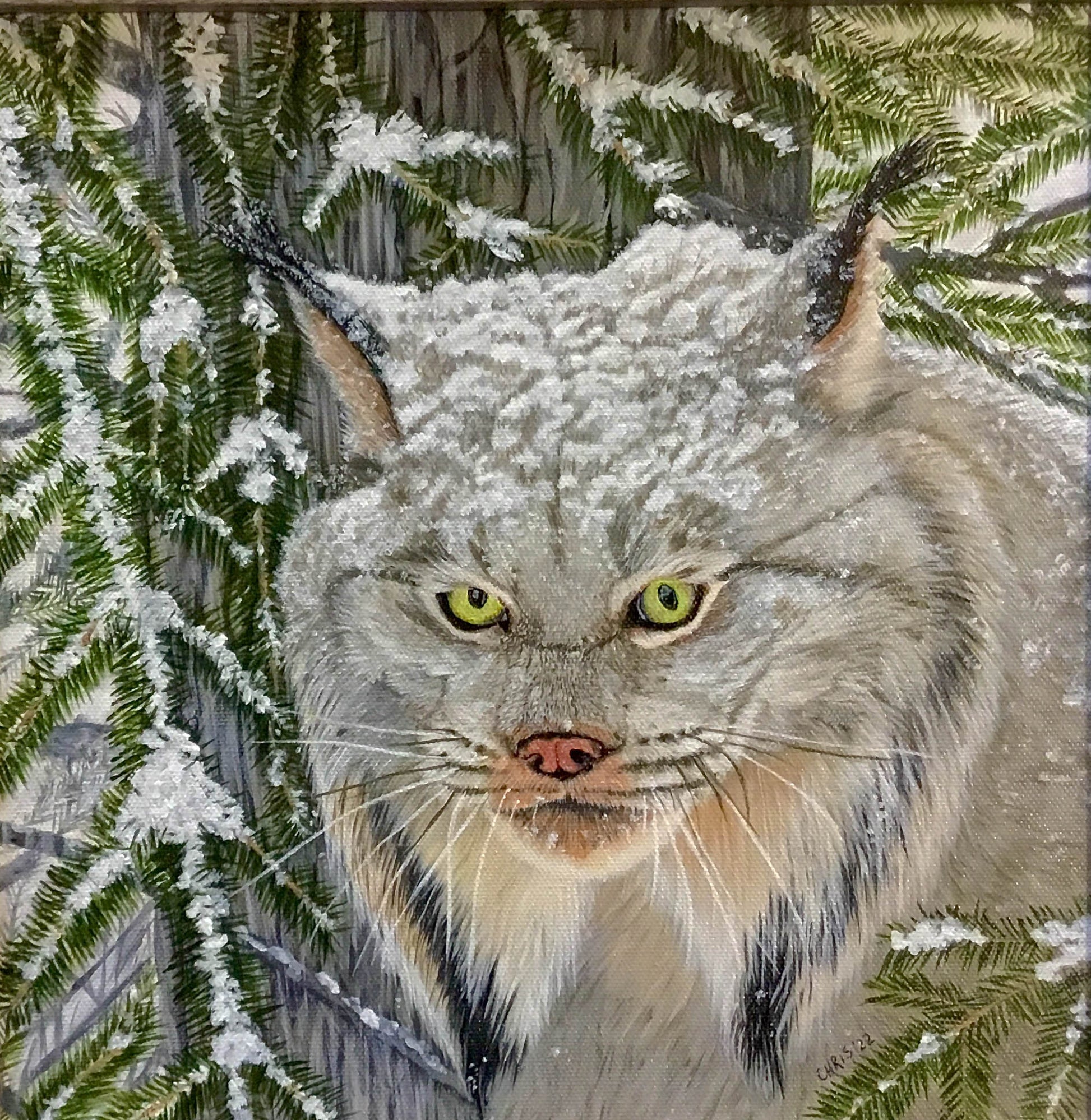 A Winter Lynx nestled in a snowy balsam fir grove.