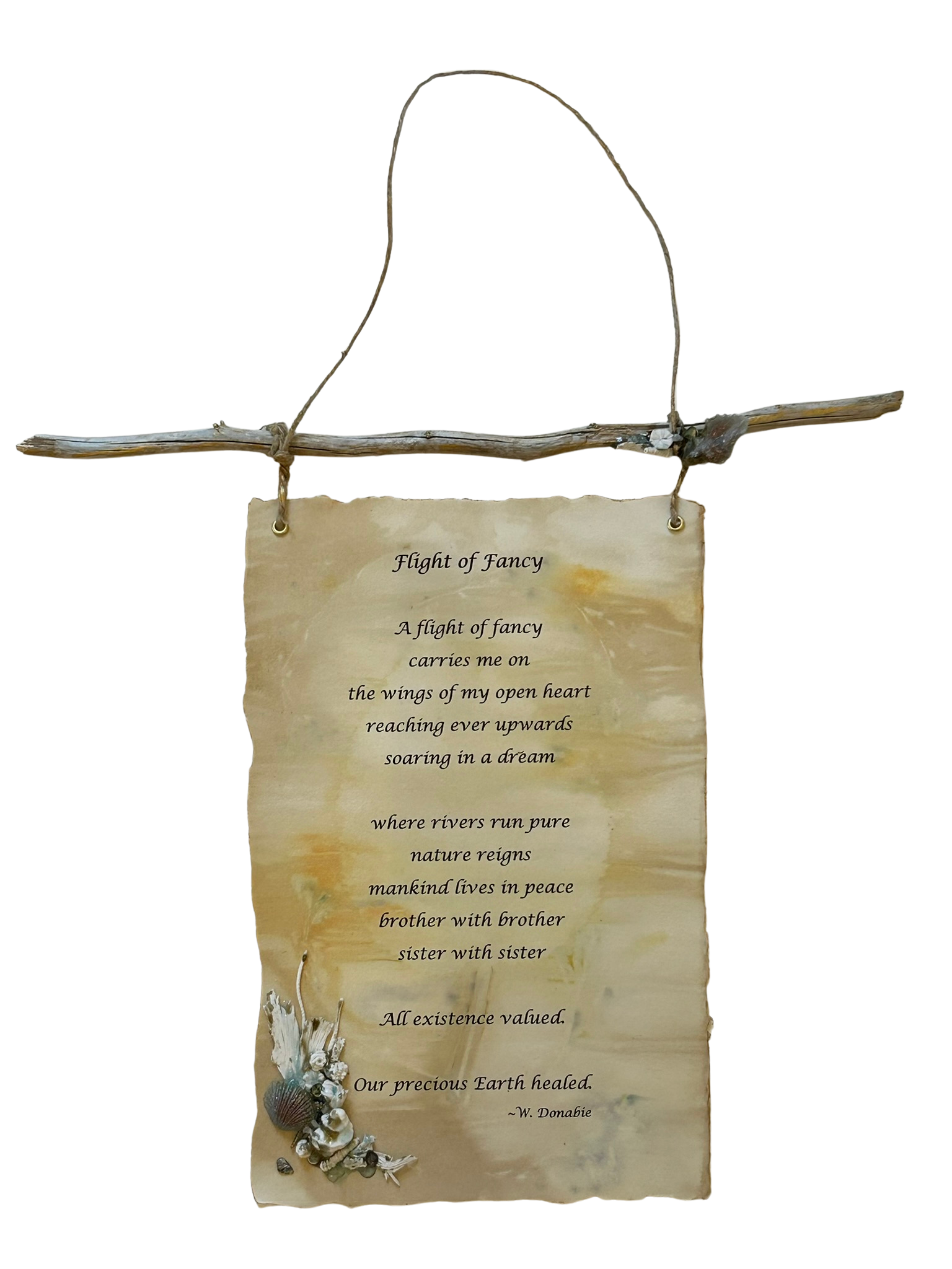 Medium: Poetry on eco printed Paper, hanging on natural cord from driftwood, polymer clay,clear quartz, resin shells, abalone, mica powder, resin