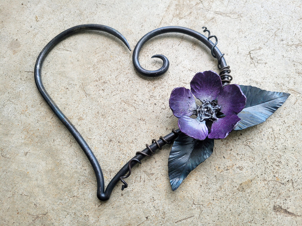 | This elegant and romantic wall artwork features an everlasting iron flower with metal leaves and vines wrapping around a hand-forged heart. These artworks are typically made to order and every part of this sculpture is completely forged by hand, so every artwork is slightly unique! Custom versions of this design are available to create the perfect personalized gift! Have your sculpture custom made with your choice of flower colour, and even include a custom inscription in the metal! Contact us to discuss custom requests before placing your order This metal sculpture can hang on your wall from a simple nail or pair it with one of our forged steel hooks! (Contact us for suggestions) The sculpture measures approximately 7-8 inches in size (exact measurements vary slightly between each artwork) |