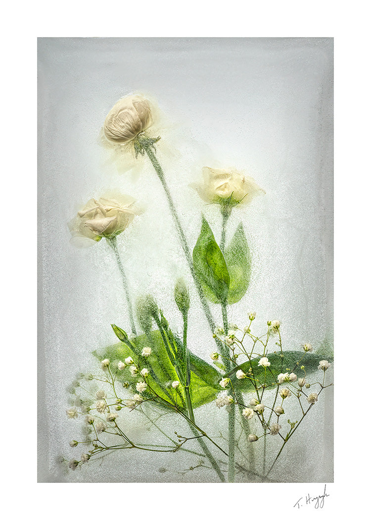 There is a magic to creating images when bringing together Flowers and Ice. Although the process can be difficult at times, what I love is the serendipitous aspect to the creative ending. I can plan the color, the arrangement, and the story, yet the ice has a say on how it is all going to end. It is a joyful process to see how the flowers react to the hold ice has on the plant world.