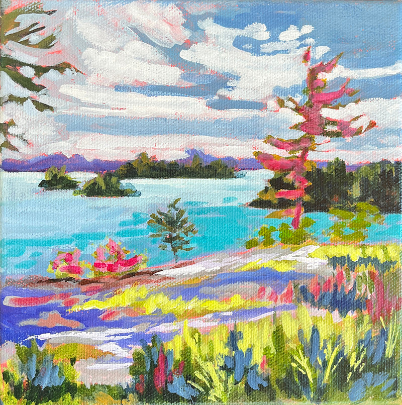 Experience the beauty of Canada's Georgian Shores with this vibrant lakeside painting. The bright colours and vibrant clouds will transport you to a summer paradise.