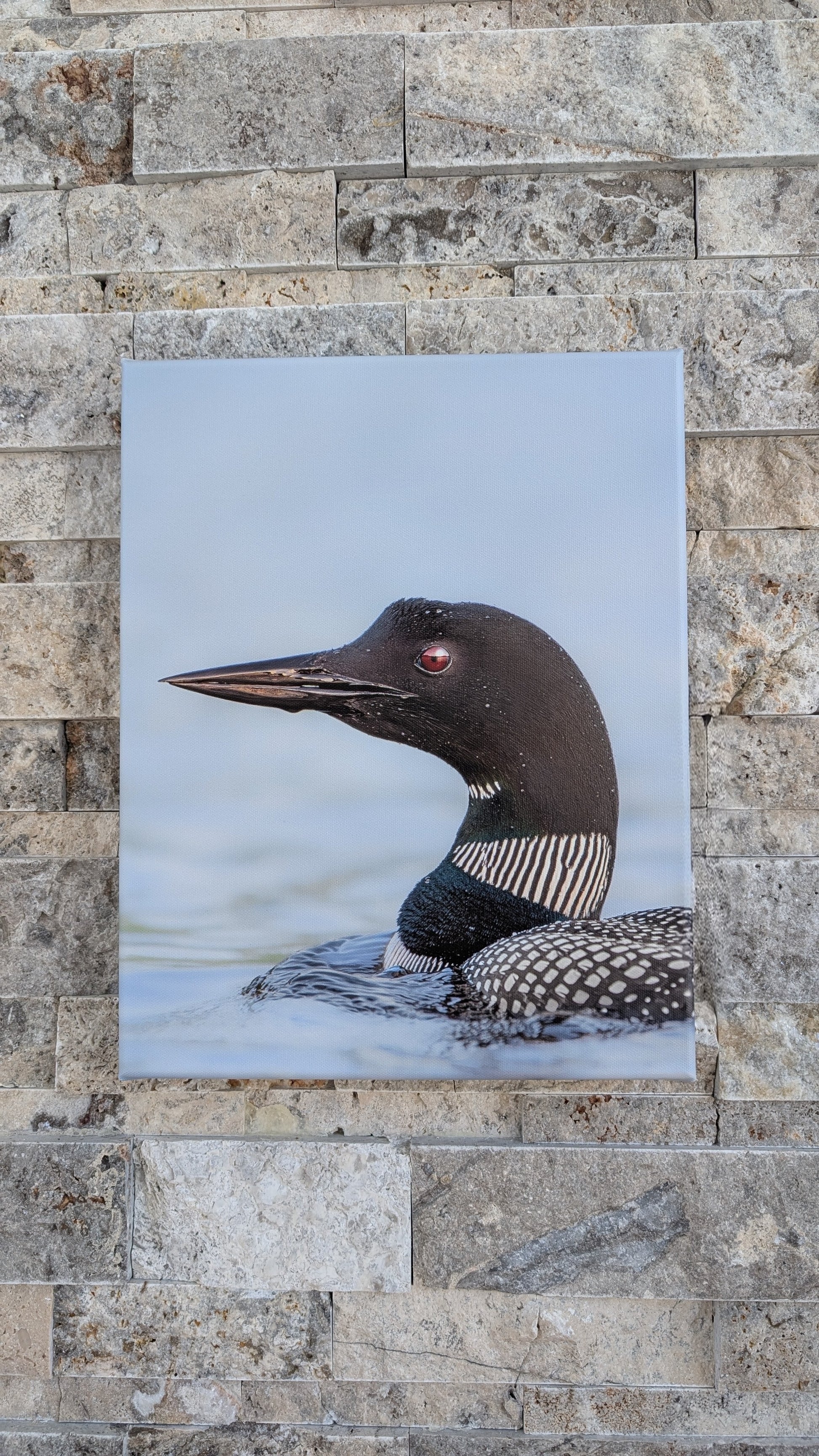 This photograph of a common loon was taken on Deer Lake near Sundridge, Ontario. There's nothing better than watching a loon glide across the glass-like lake while relaxing on the dock at the cottage.