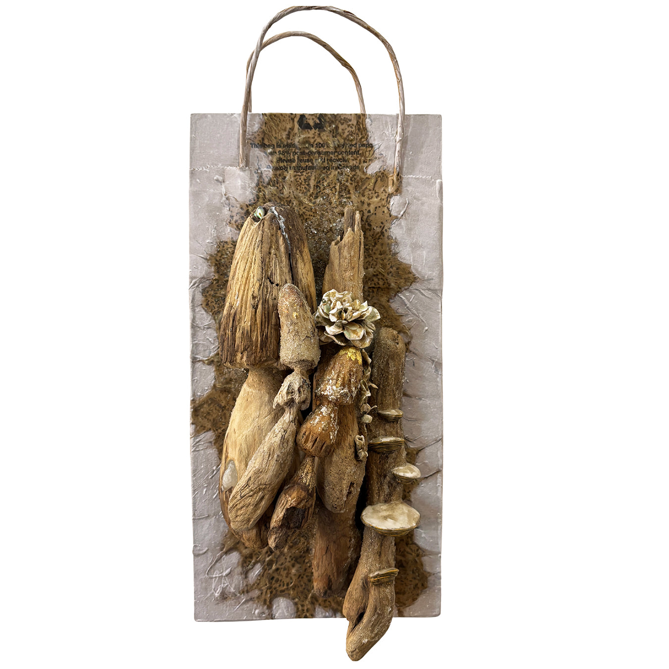 Medium: Dirftwood, albacore, rose quartz, foam clay, paper bag, acrylic mediums, on panel