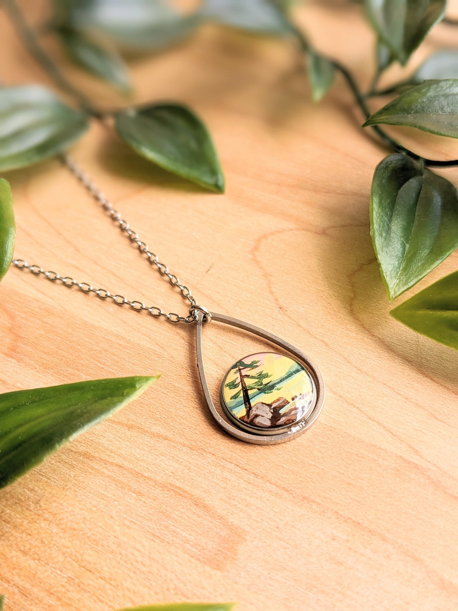 Windswept Tree Teardrop Necklace - Add a touch of Ontario’s natural beauty to your look with this hand-painted teardrop necklace. The artwork features a windswept tree by a tranquil lake at sunset, capturing a classic Ontario landscape scene. Perfect for those who love nature-inspired jewelry and want to showcase a piece of serene beauty. Embrace elegance and charm with this unique necklace today.