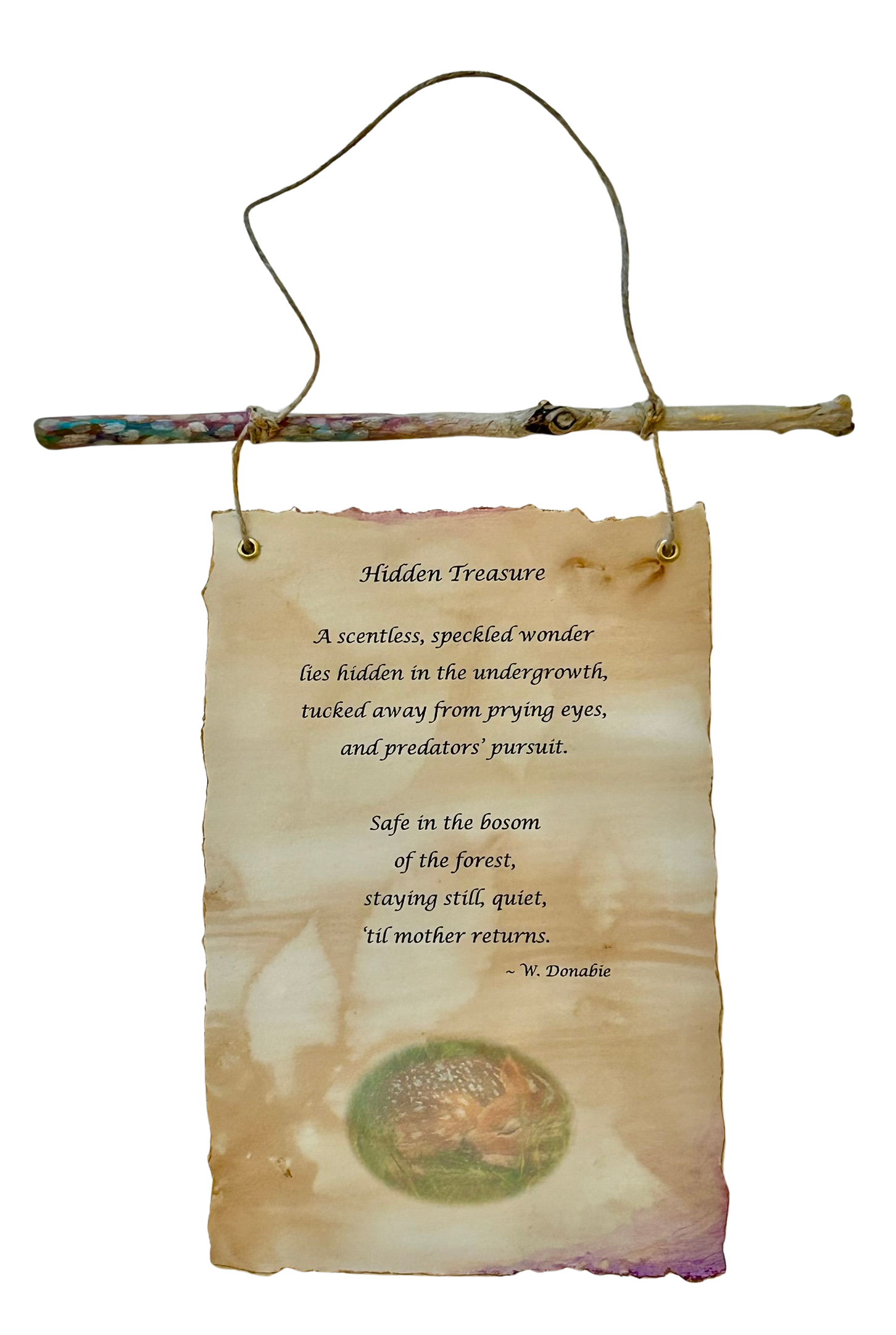Medium: Poetry on eco printed Paper, acrylic paint, hanging on natural cord from driftwood