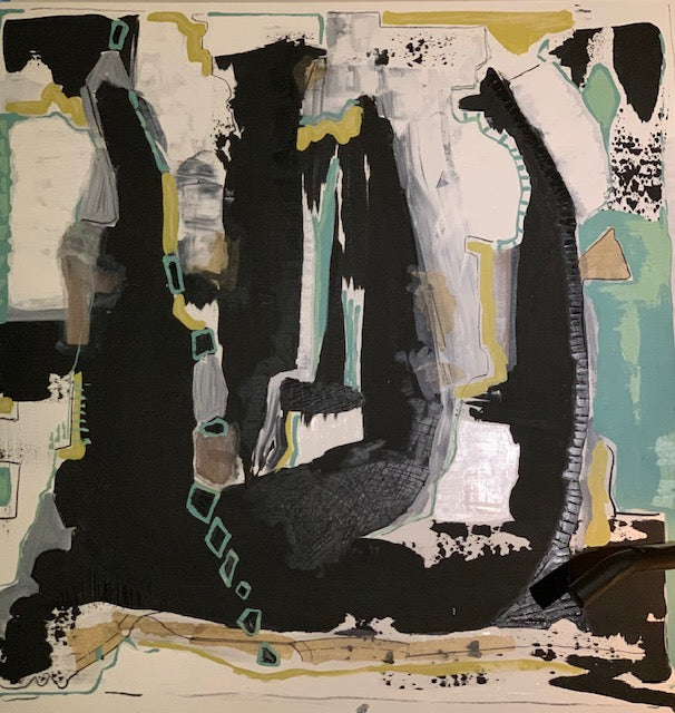 An abstracted landscape inspired by the film Anselm, this mixed media painting incorporates collage, acrylic, and oil on gallery depth canvas.