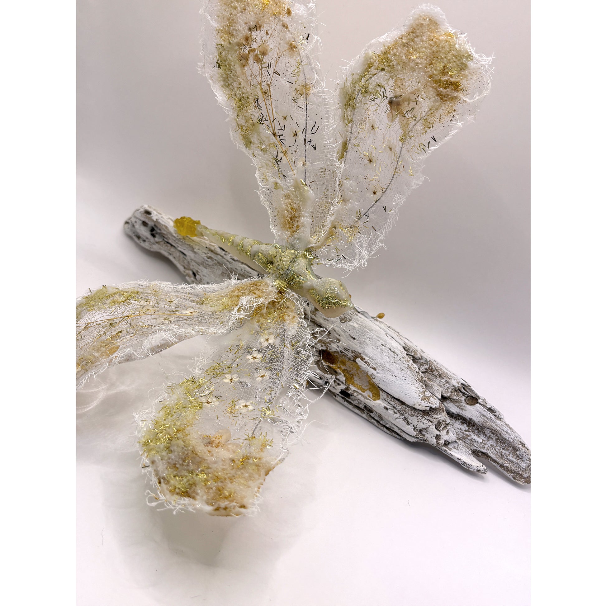 Medium: Resin, resin shells, wire, cheese cloth, Citrine, dried flowers, tinsel, acrylic, mica powders, driftwood