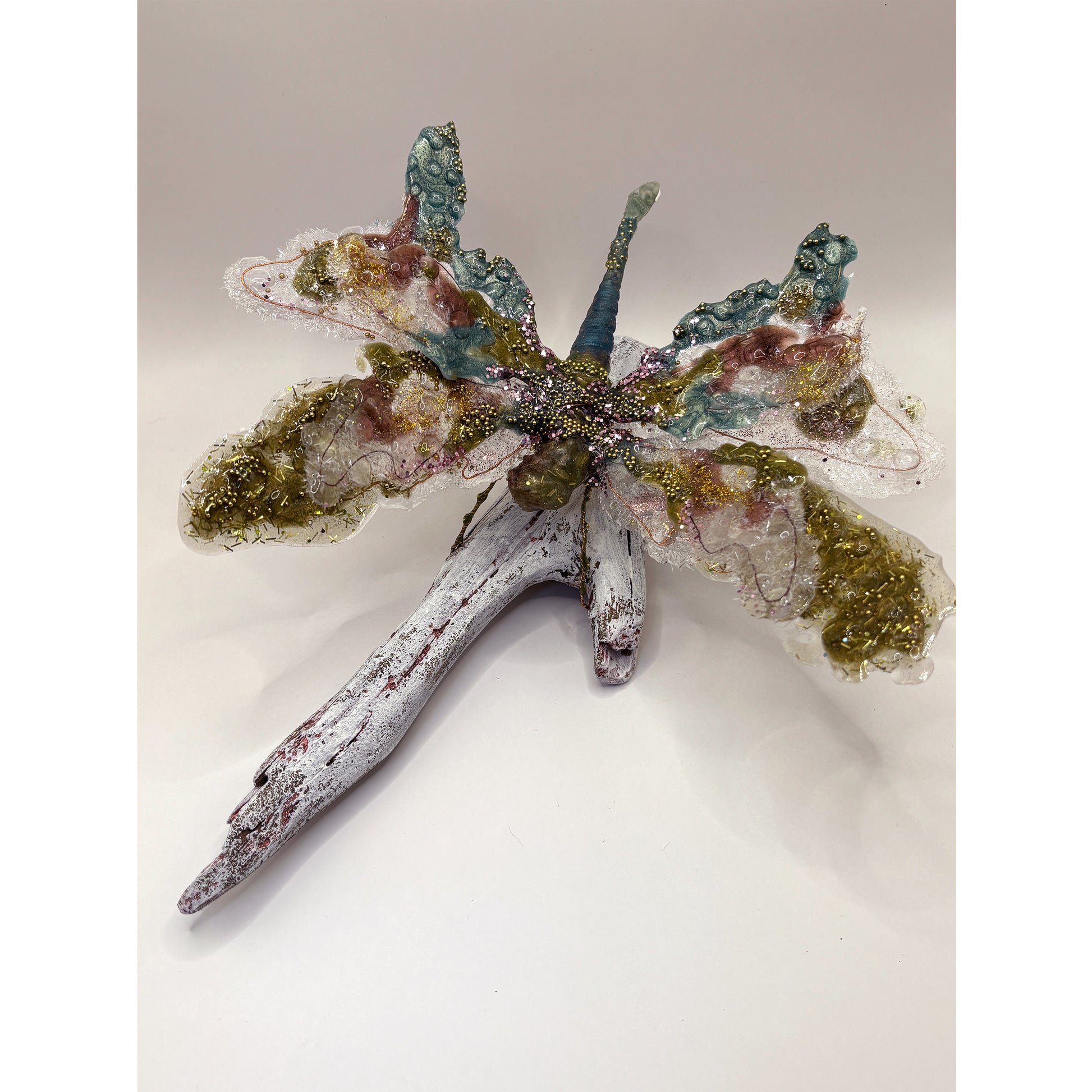 Medium: Resin, resin shells, wire, microbeads, Adventurine, glitter, acrylic, mica powders, driftwood