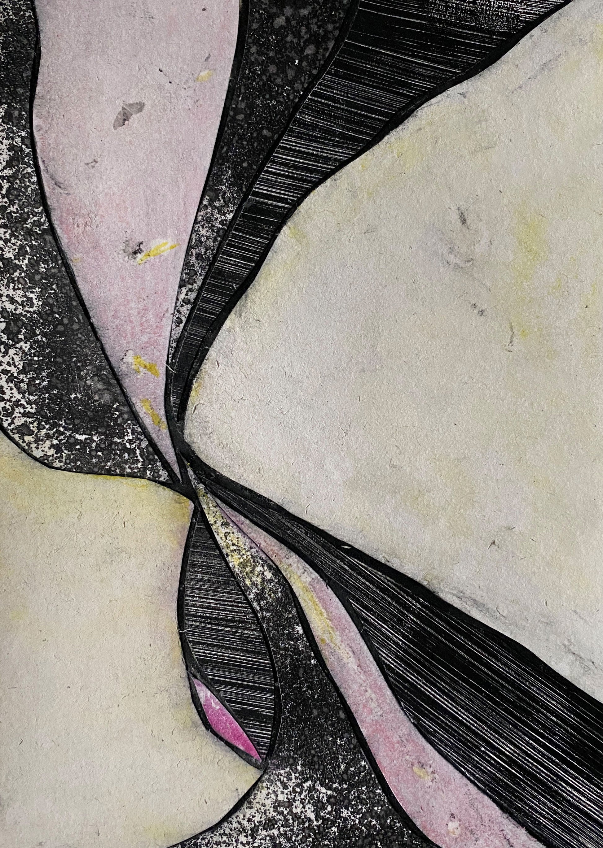 My take on collage is more like mosaic where cut pieces of plain or monoprint papers are fit together and glued down in intricate patterns then enhanced with water-soluble pigments and charcoal. Influenced by our local landscape of forests and rivers, these collaged paper abstracts are a wonderful way to bring organic beauty into your home. Each piece is a little meditation on the natural world.