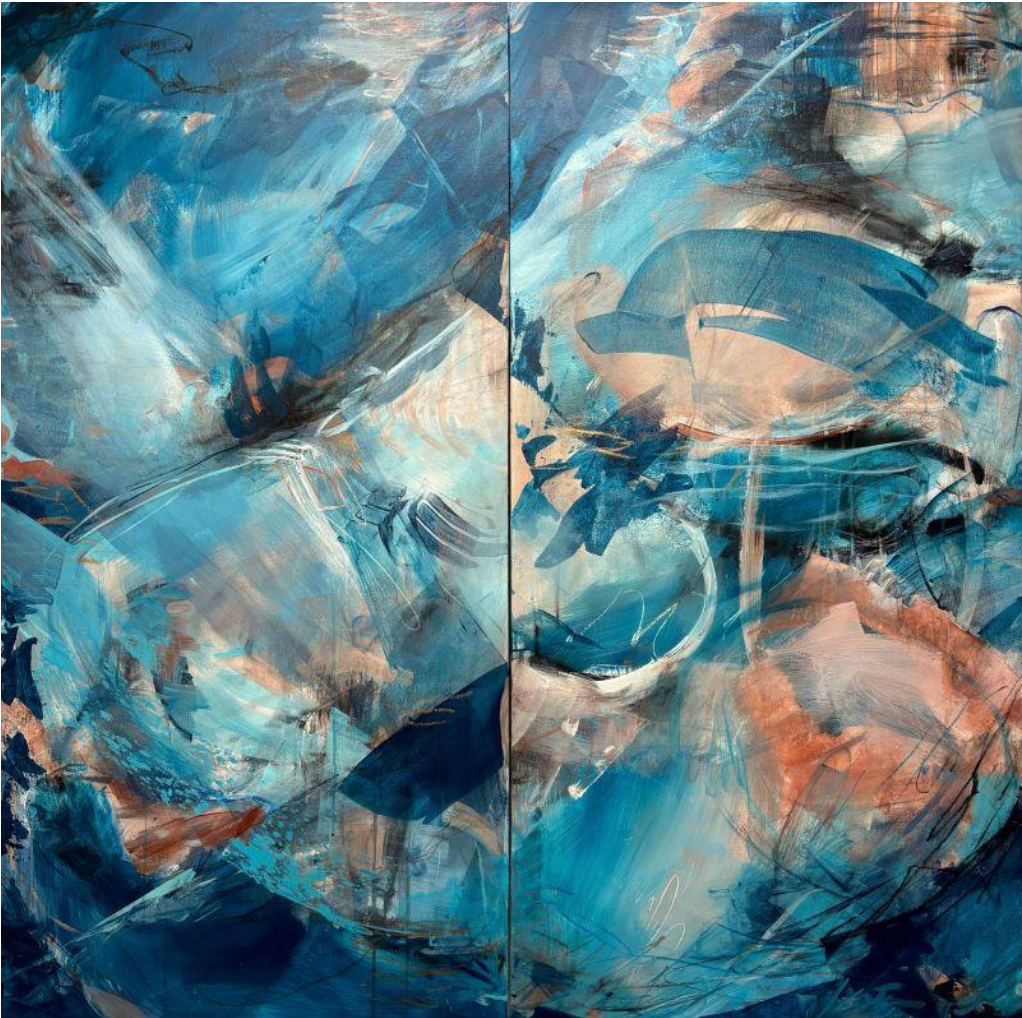 This is a diptych - 2 pieces that are 24” x 48” on gallery depth, wood panels. Edges are wrapped with the painting. Satin varnished. Ready to hang.