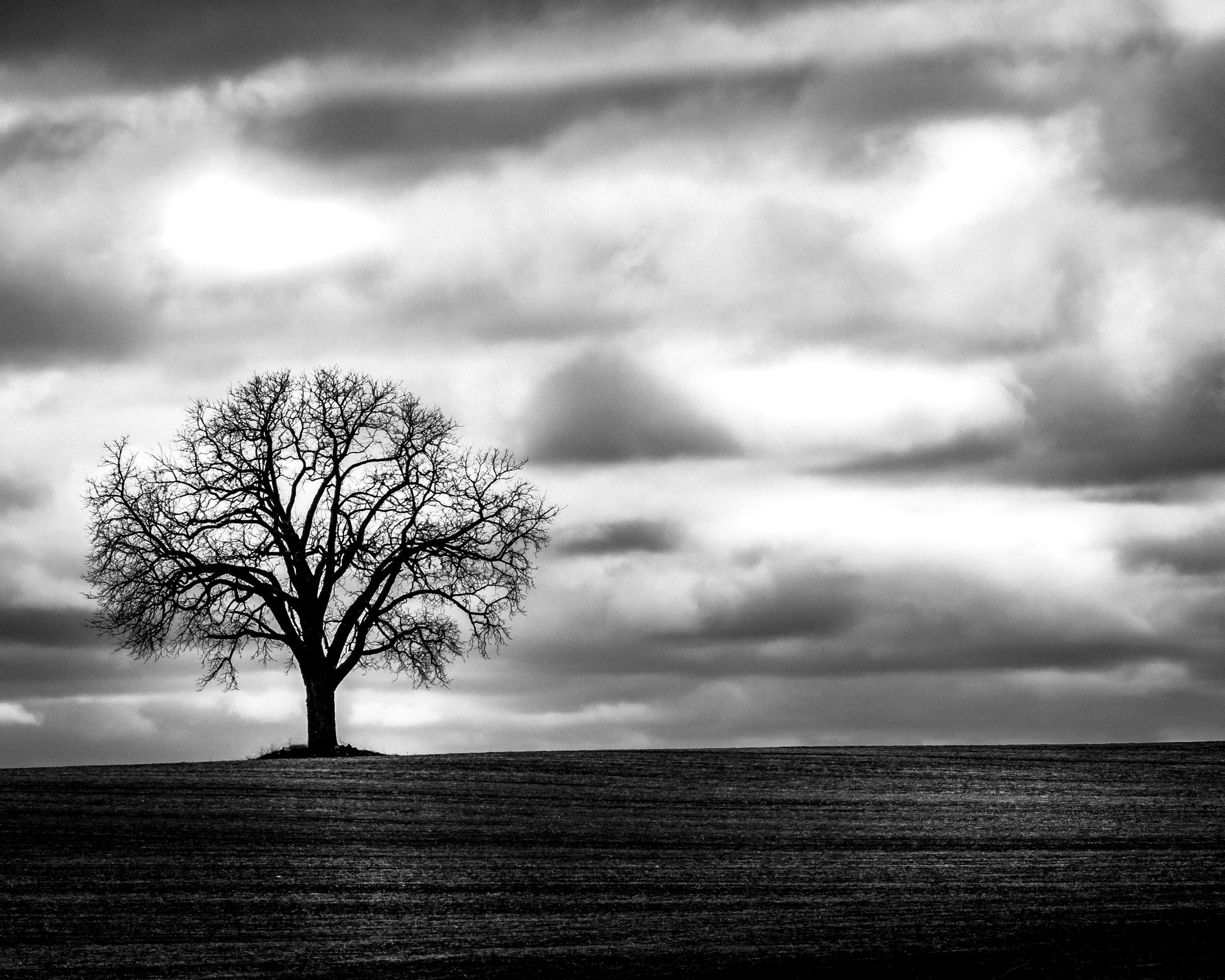 A lone maple tree stands tall in a large farmer's field north of Markham Ontario. The rolling and furrowed landscape provides and interesting textured foreground against a backdrop of a cloudy dramatic late autumn sky. 16"x20" Matted & Framed.