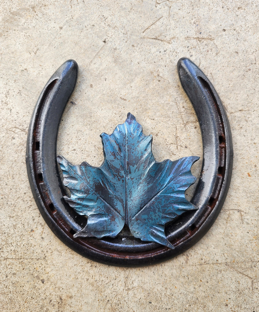 This lucky and iconic Canadian artwork features a hand forged iron Maple Leaf inside an authentic steel horseshoe. The sculpture is easily displayed on a shelf or hung on your wall (using the holes in the shoe). Each version of this sculpture is handcrafted from a real horseshoe which has been cleaned and re-forged at our rural Niagara studio, turning it into a one-of-a-kind frame for the piece. Every maple leaf is also hammered completely by hand, so every version of this design is slightly unique. Once forged, the individual pieces are welded together to create the final artwork. The whole artwork is sealed with a clear varnish and then oiled, protecting against rust and adding a gentle shine.