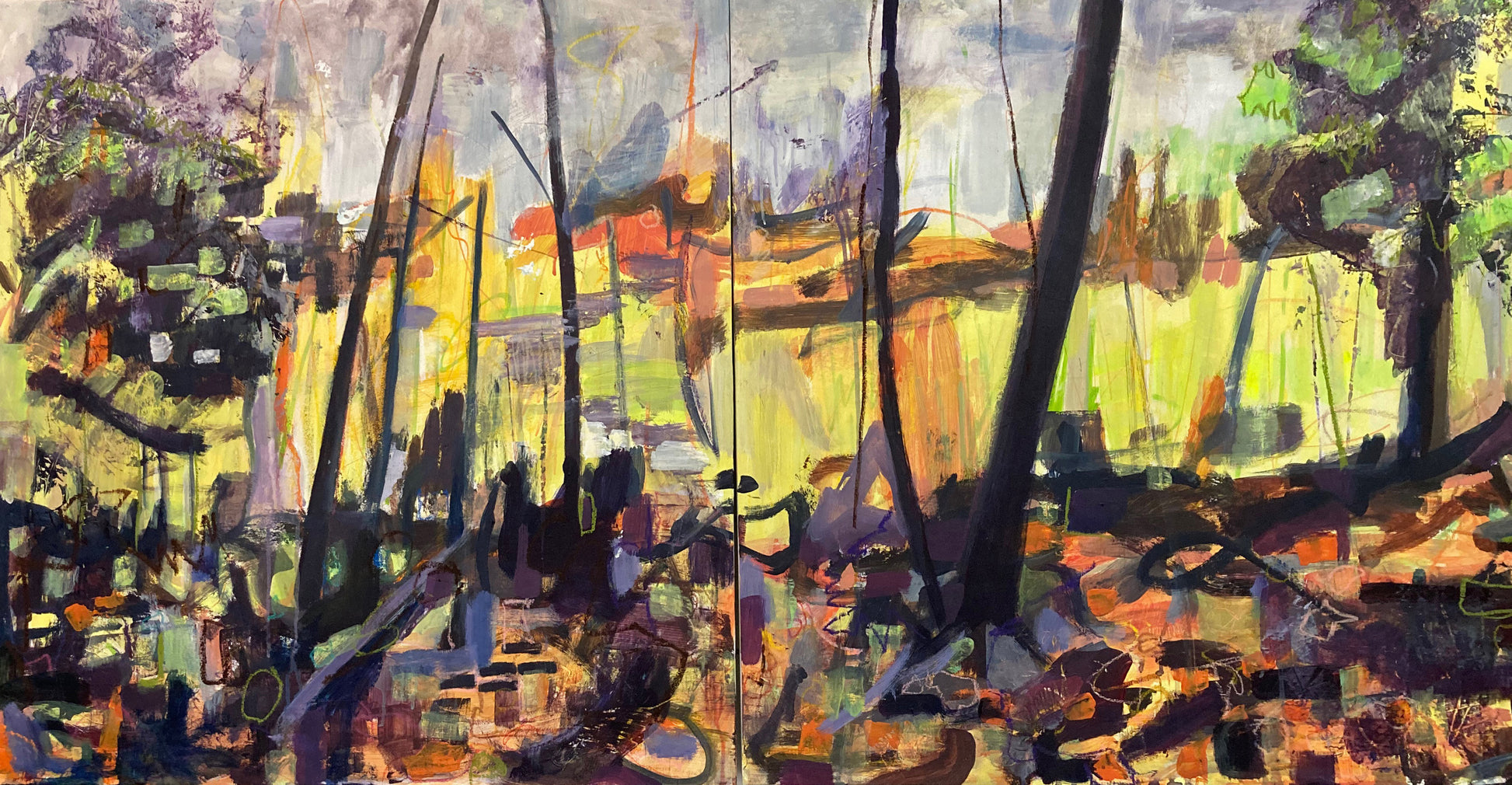 I’ve spent more time at my cottage walking my dogs every day, and enjoying the sights of nature. Nearby we have a marsh that I like to observe. Looking through tree branches in the fall at the morning light is what inspired this piece. Each piece could work independently, but I think they work best together as a diptych.