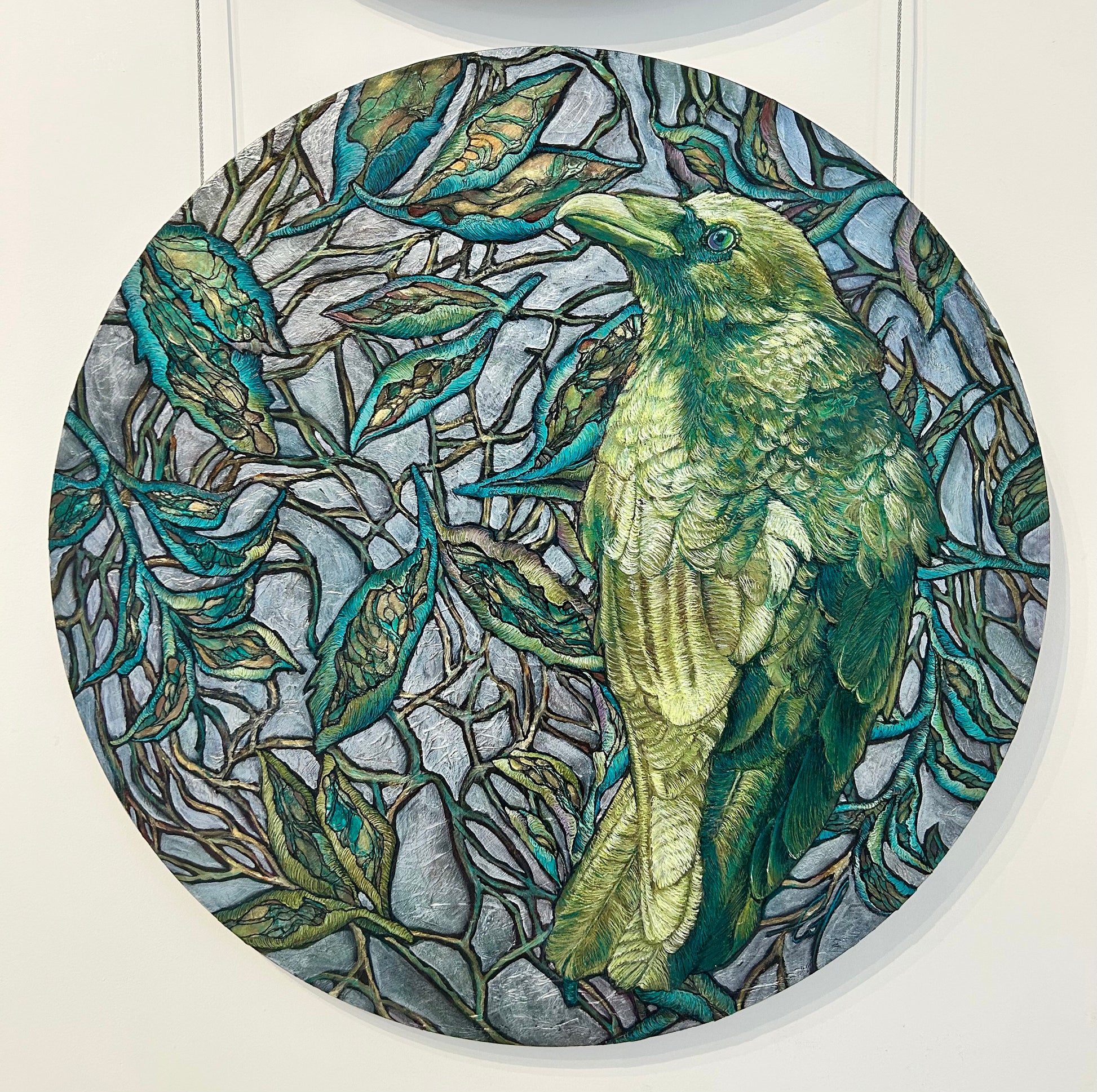 Medium: Pen and Ink on Sculpted Paper, hand cut feathers, acrylic on panel