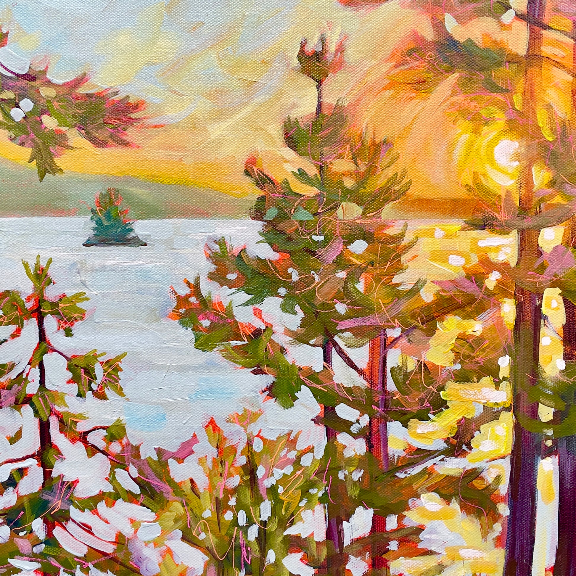 This acrylic painting depicts a vibrant sunrise over a tranquil lake. Golden light filters through the pine trees in the foreground, casting warm hues of orange, pink, and green across the scene. The calm water and distant landscape reflect the morning glow, creating a serene and peaceful atmosphere.