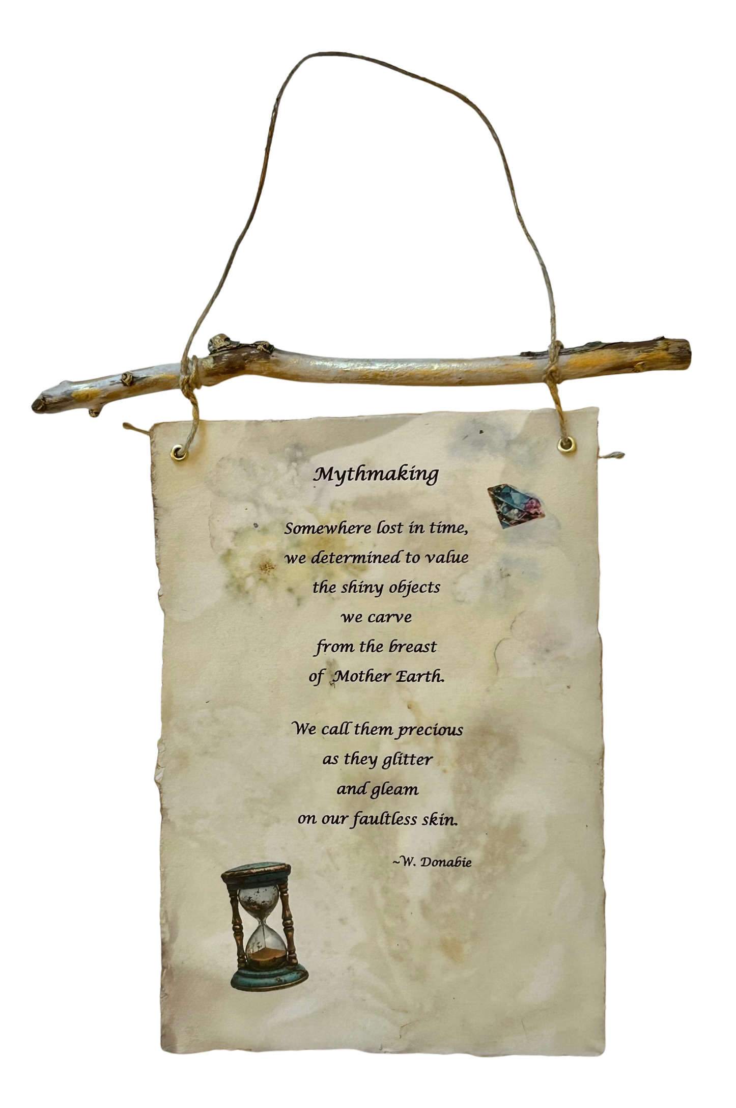 Medium: Poetry on eco printed Paper, hanging on natural cord from driftwood
