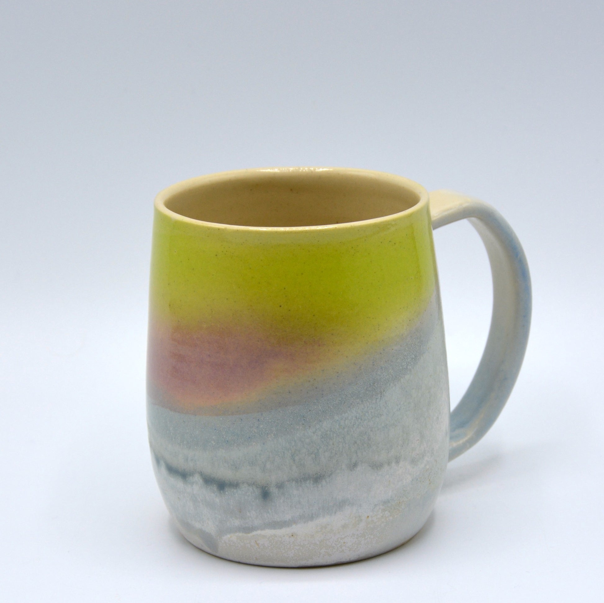 Each mug is thrown on my potters wheel. The mugs are fired in my home studio in Ottawa, made of hardwearing stoneware and are dishwasher safe. Mugs are glazed with food safe glazes inside. The exterior finish glows with the beautiful colors of the northern lights. Each mug comes out slightly different depending on the spray application of the glaze.