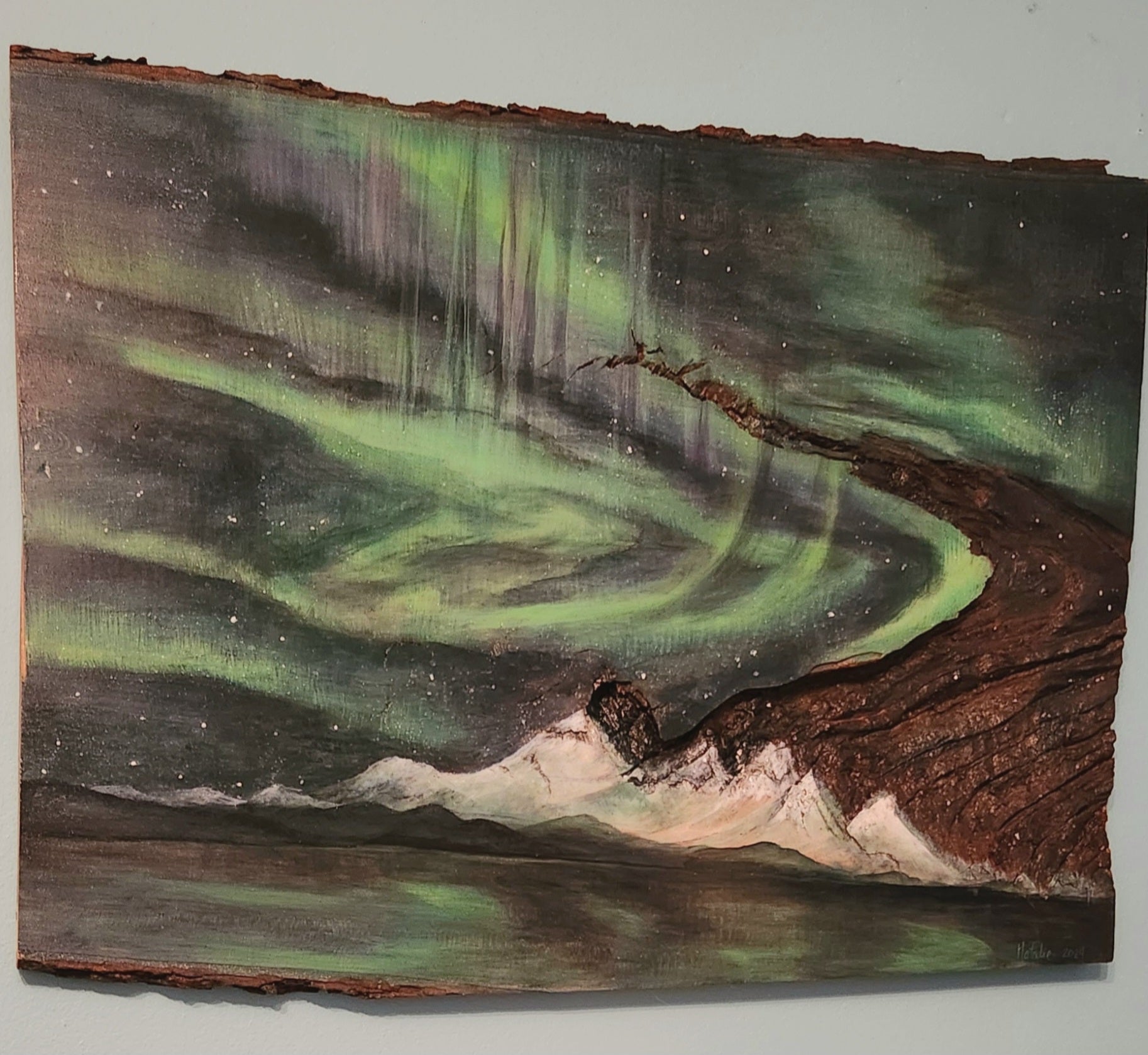 This piece was created by looking at the wood and what it showed me. Looking at it at different angles I saw a waterfall, a dragon and trees, but the one that I kept coming back to were mountains with a sky filled with Northern Lights. What an amazing show of lights mother nature likes to share with us. 24"x17"