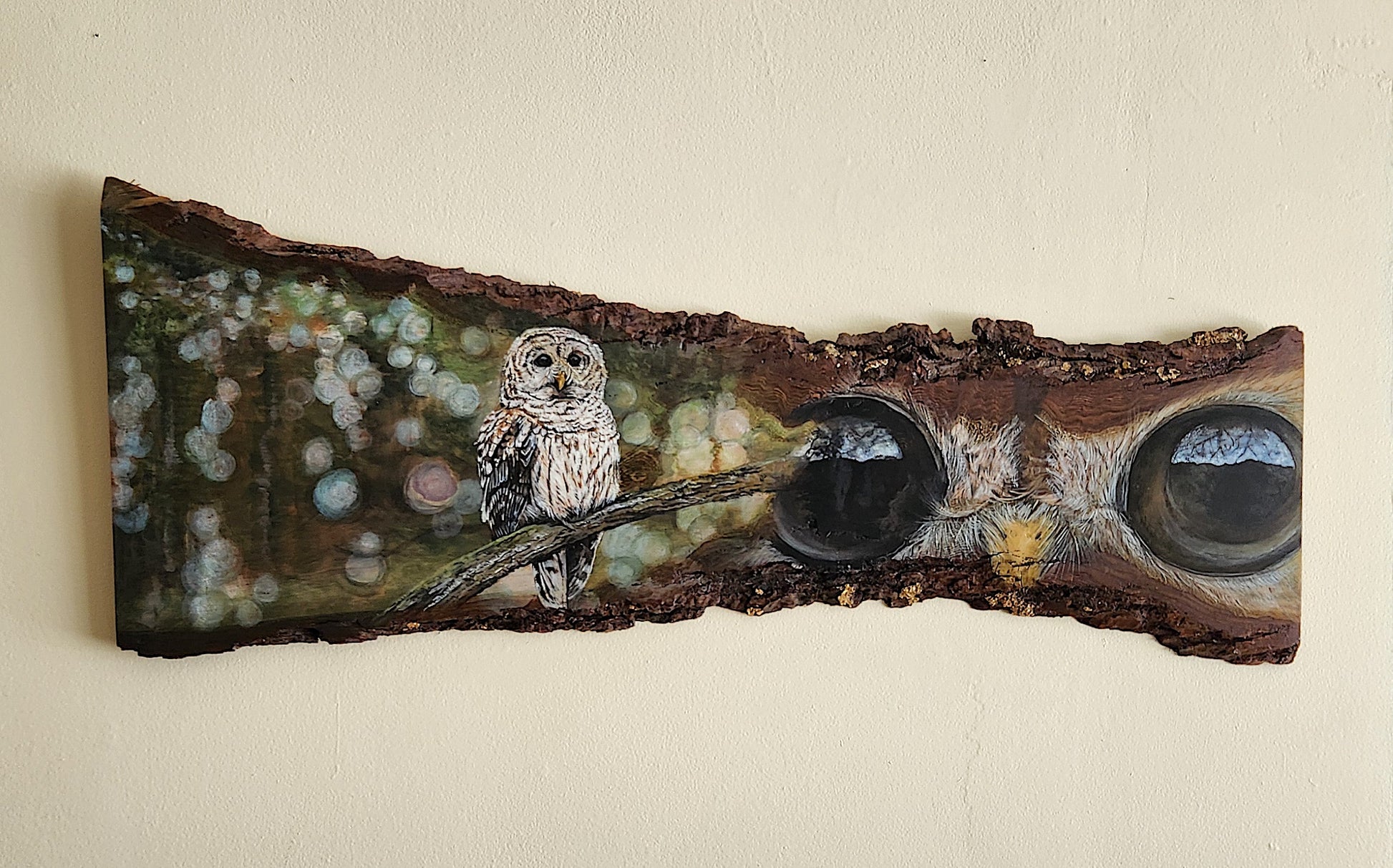 This was inspiration from Aaron Todd’s photos. Those eyes say it all, they capture the intensity of the owl and he is definitely looking out! This was also such a fun piece of wood to paint on, trying to keep some of the grain showing and it just adds interest to the whole piece.
