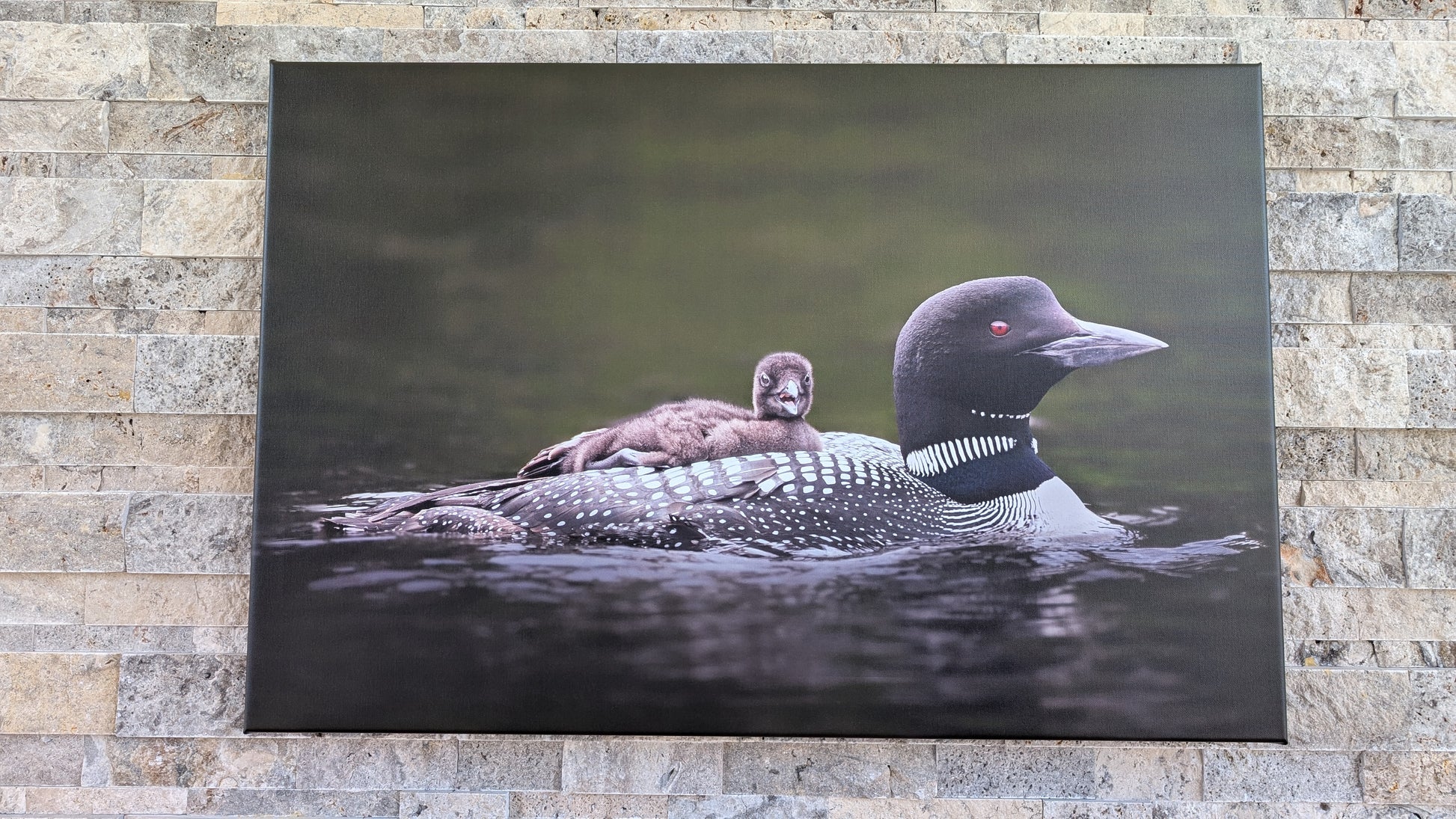 This photograph of a parent loon and its loonlet was taken on Deer Lake near Sundridge, Ontario. My parents took me for a boat ride around the lake in search of loons. Once we found this parent-baby duo, we stopped the boat motor and quietly floated around the loons. I captured some photos before leaving them to be. I was lucky enough to get this shot with the baby staring right at me.