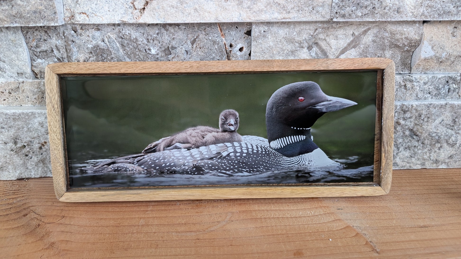 This photograph of a parent loon and its loonlet was taken on Deer Lake near Sundridge, Ontario. My parents took me for a boat ride around the lake in search of loons. Once we found this parent-baby duo, we stopped the boat motor and quietly floated around the loons. I captured some photos before leaving them to be. I was lucky enough to get this shot with the baby staring right at me.