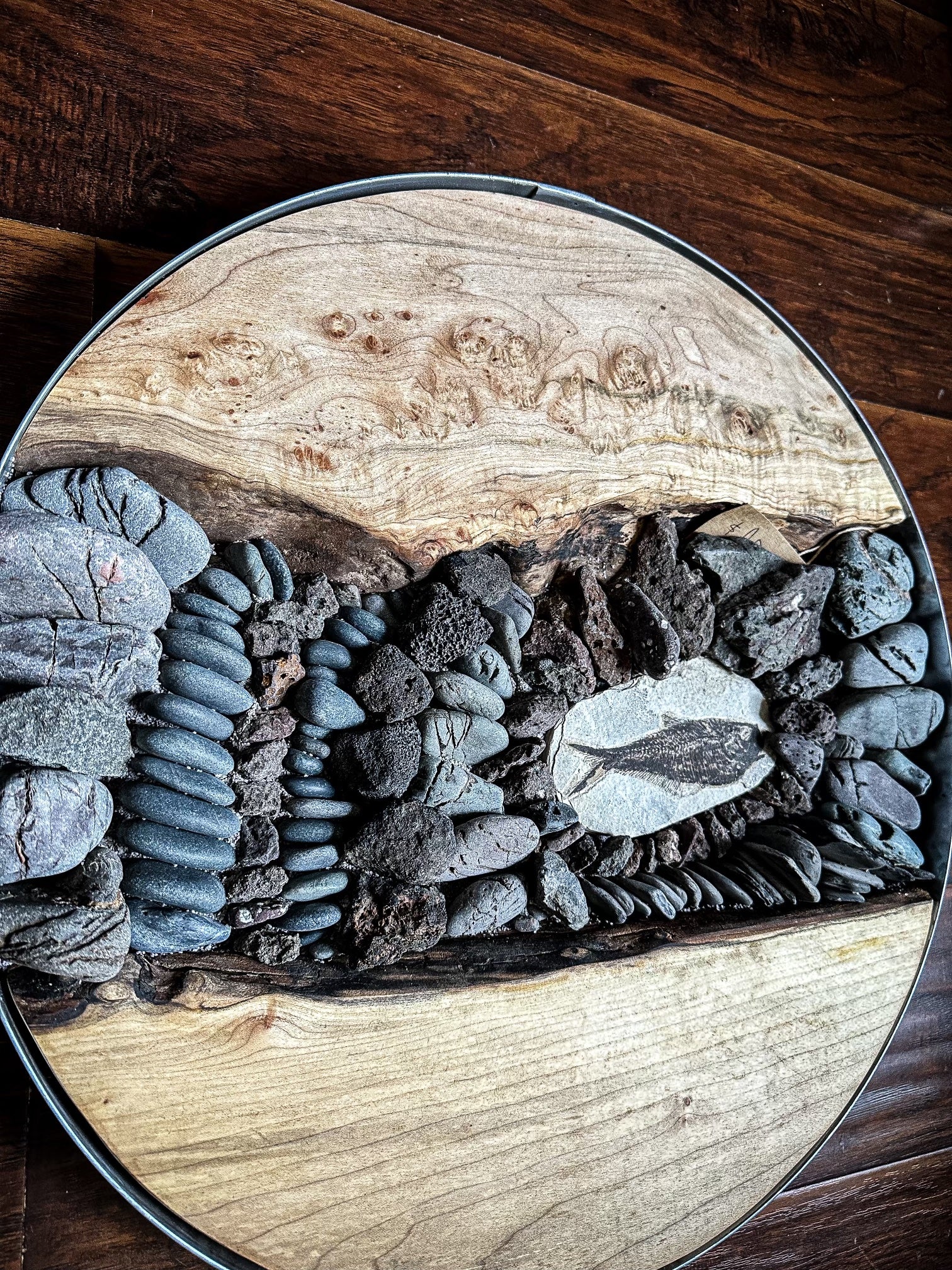 Our signature stone art with live edge wood makes for a naturally unique artistic wall feature.