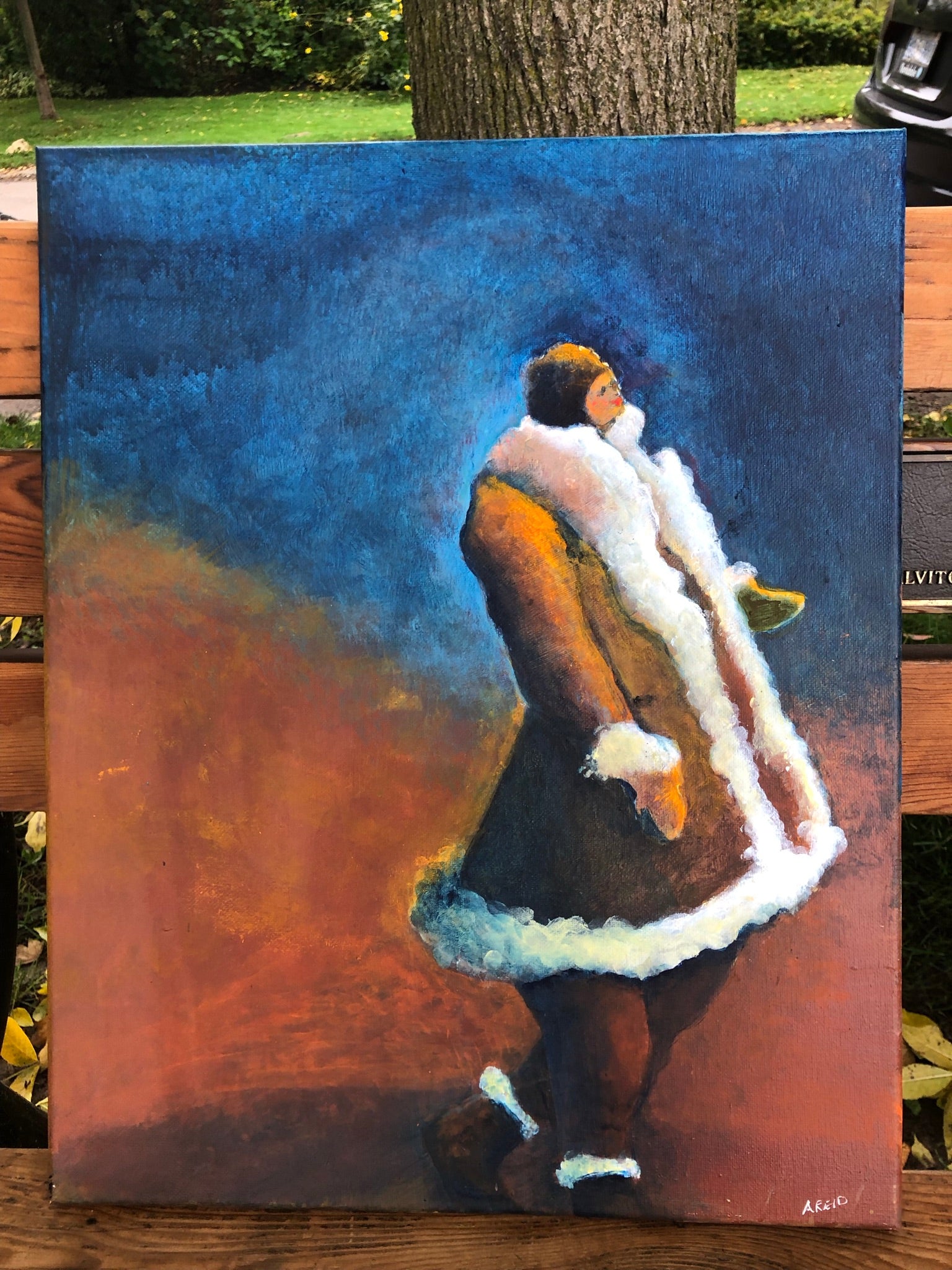 | She’s So Fine is a portrait of winter resilience. A lone figure strides across a field of midnight blue and embered ochre, wrapped in a fur-trimmed coat whose silhouette echoes an Inuit parka. Velvety glazes set a warm–cool colour dialogue; soft atmospheric passages meet crisp highlights that rim the collar and cuffs, drawing the eye to her poised profile and forward step. The generous negative space heightens the sense of wind, breath, and distance, while subtle textures suggest packed snow beneath. Though the setting is spare, the story is full—endurance, care, and the quiet grace of moving through a harsh season with dignity. This painting invites viewers to feel the North—its hush, its bite, its beauty—and to meet the woman’s strength with their own. |