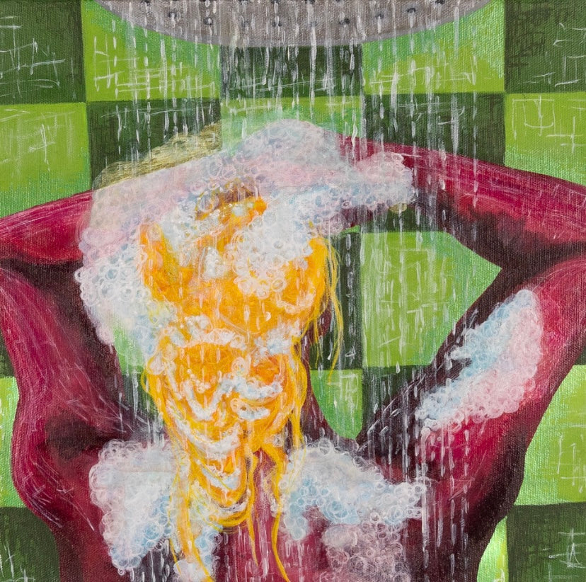 This painting captures a quiet, intimate moment. A woman washing her hair beneath a stream of warm water, immersed in a ritual of self-care and solitude. There is no audience here, no performance. Just the raw, unguarded act of tending to oneself.