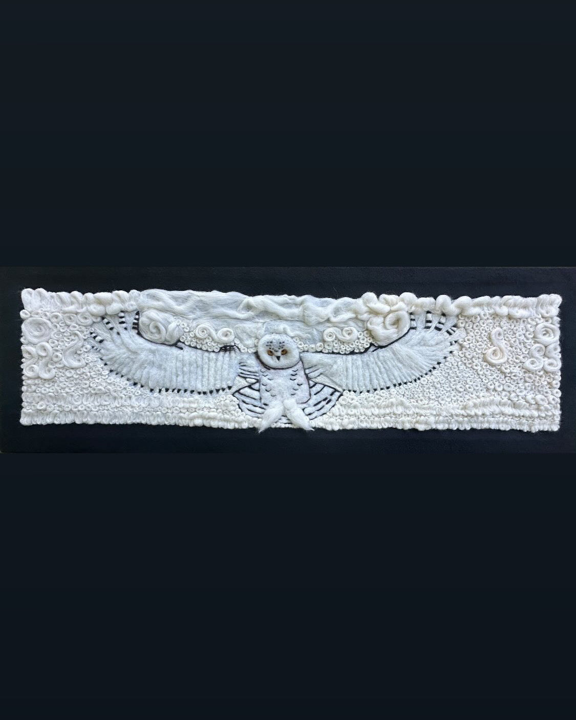 A snowy owl in flight, against a background of snow, is a dynamic image evoking freedom, power and beauty. Felting the image brings a third dimension into the work, as the owl emerges from the background. I am drawn often to working in black and white, which is both dramatic and restrained at once. The white owl against the white snow benefits from the textural reach of felting.