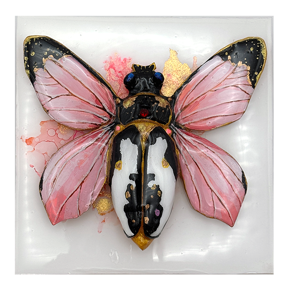 Reimagining the tradition of preserved specimens found in cabinets of curiosity and natural history collections, each is hand-sculpted, painted, and resin-finished on gilded grounds. Every specimen carries its own jewel-like detail of crystals, stones, and gilding, but together they form a luminous collection that speaks to both fragility and wonder.
