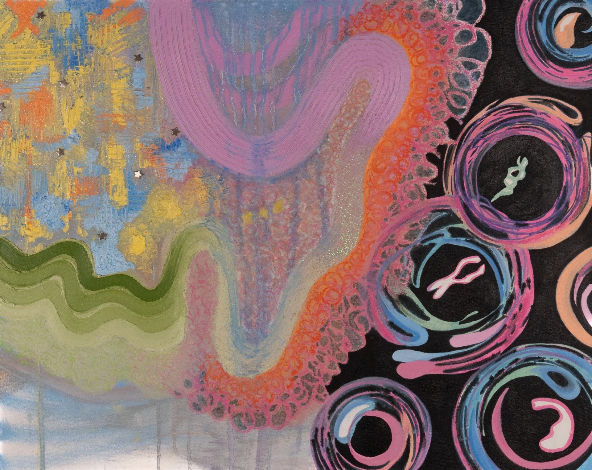 Rather than literal imagery, I let colour, motion, and texture carry the story. Swirls of iridescent hues drift across the canvas like bubbles catching the light fragile, fleeting, full of magic. This work is about presence. That rare, golden feeling when you're not thinking ahead or looking back. Just existing fully in the now. It’s the kind of bliss that doesn’t shout but sparkles, like a secret shared with the stars.
