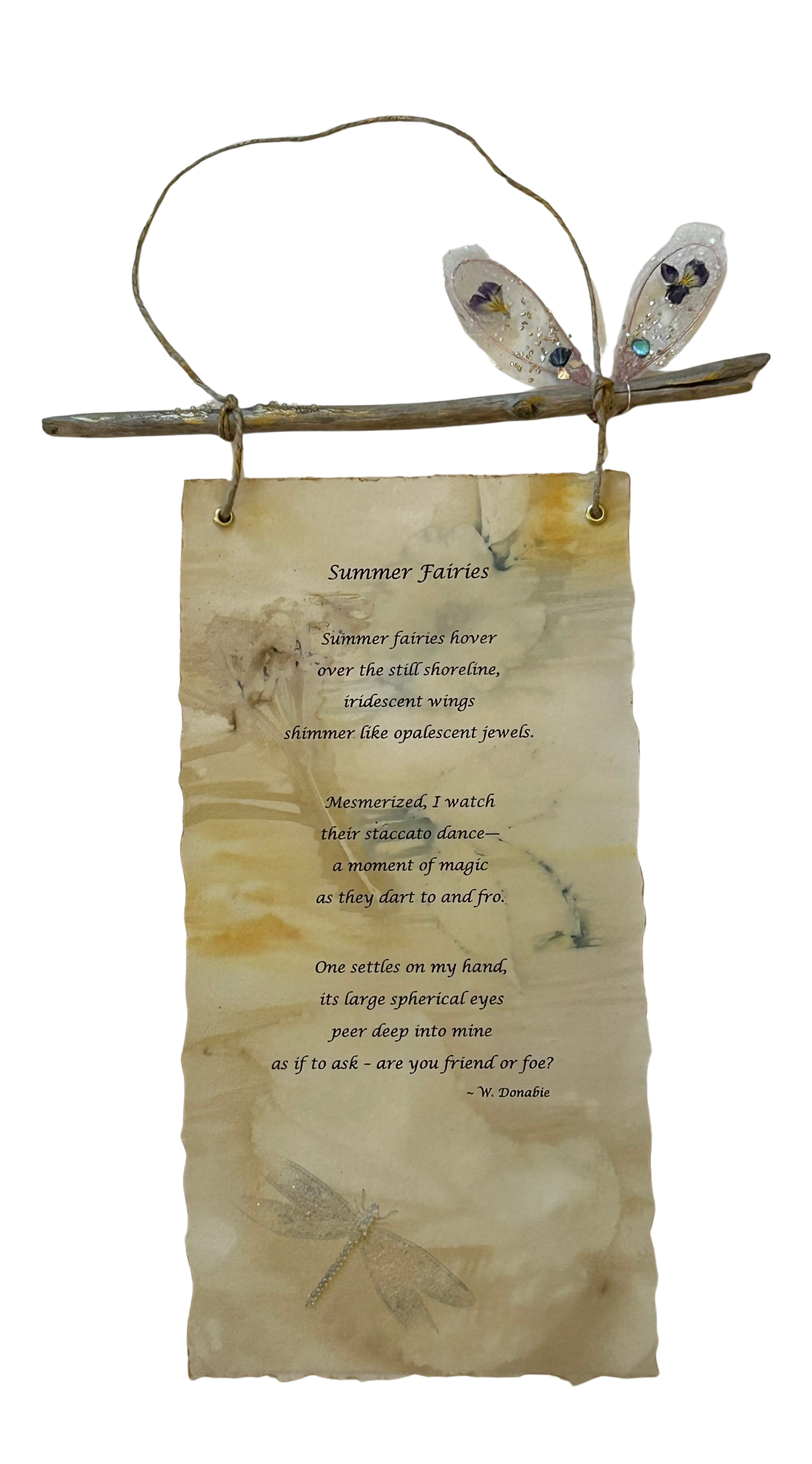 Medium: Poetry on eco printed Paper, copper wire, resin, dried flowers, abalone, chunky gold glitter, mica powder, glass bubble beads, pink glass, hanging on natural cord from driftwood