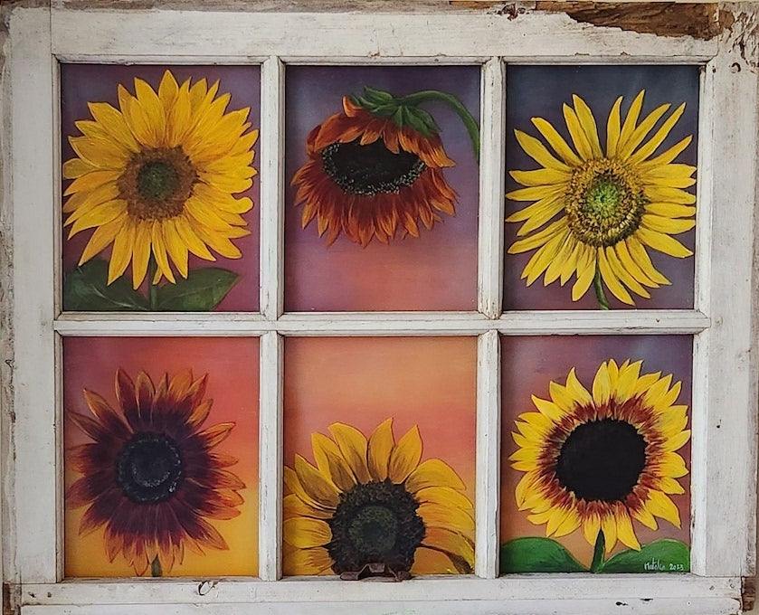 Who doesn't love sunflowers? So many different types and colours and this old window was the perfect canvas! I paint directly on the glass with acrylic paint and covered with a clear varnish to protect the painting. The window was simply cleaned up and left in the original shape I got it in. 28"x23"