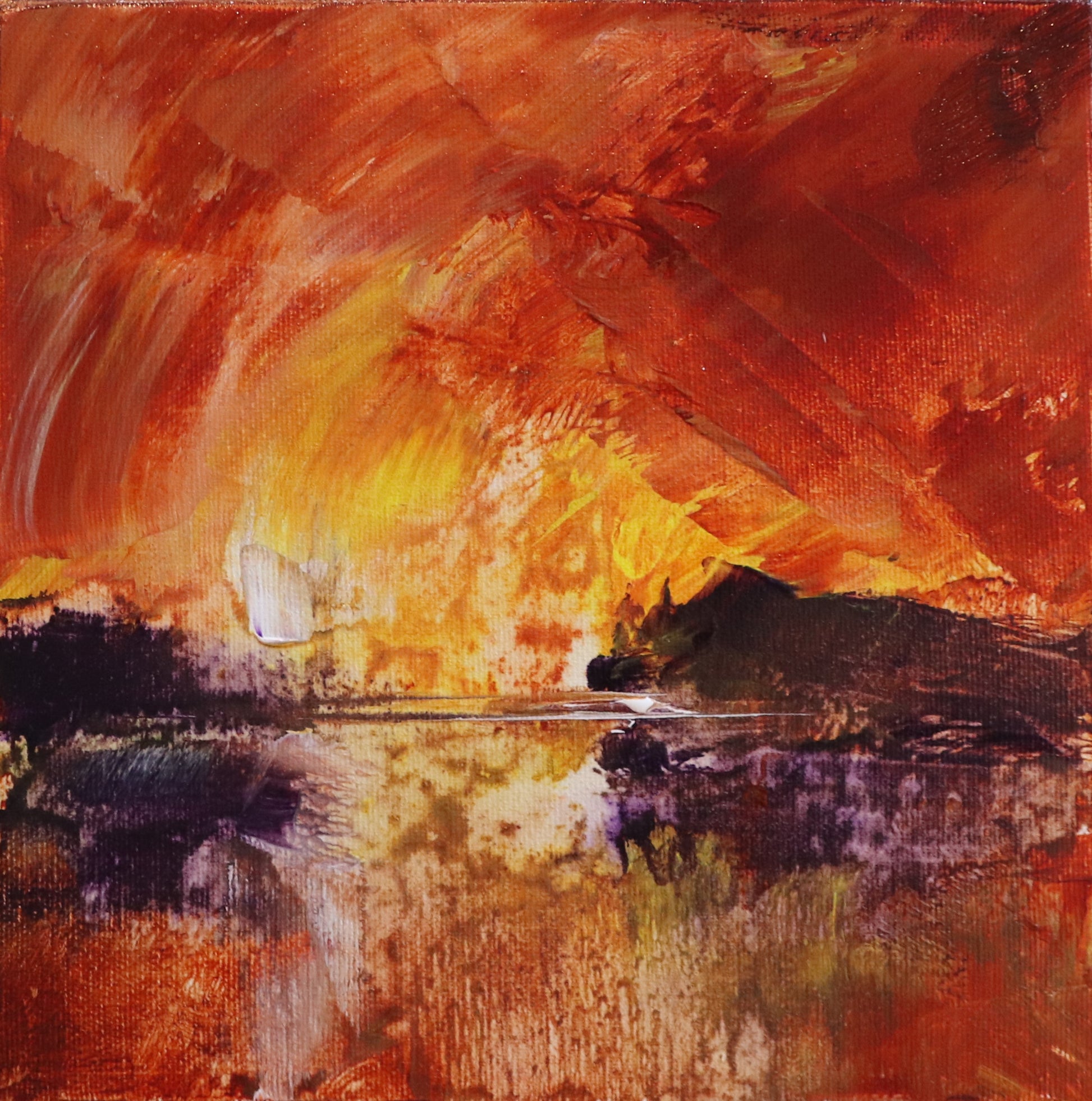 Sunset at the Lake #5 embraces the fire of the sunset as it reflects onto the lake's surface. A memory from numerous evenings in the summer sitting on the dock. Bright colour and minimal detail gives the viewer room to imagine being there. Gallery canvas, unframed.
