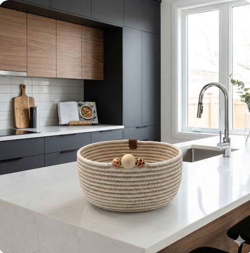 Add a touch of rustic warmth to your home with this handcrafted rope bowl. We’ve woven natural jute fibers directly into the coils to create a beautiful, earthy stripe against the soft cotton rope. Finished with a trio of decorative wooden beads and a genuine leather accent tab, this piece is designed to be as stylish as it is strong. It is the perfect size to organize your daily life—use it as a dedicated "catch-all" in your entryway for keys, wallets, and sunglasses, or let it sit center stage on your kitchen island to corral clutter.