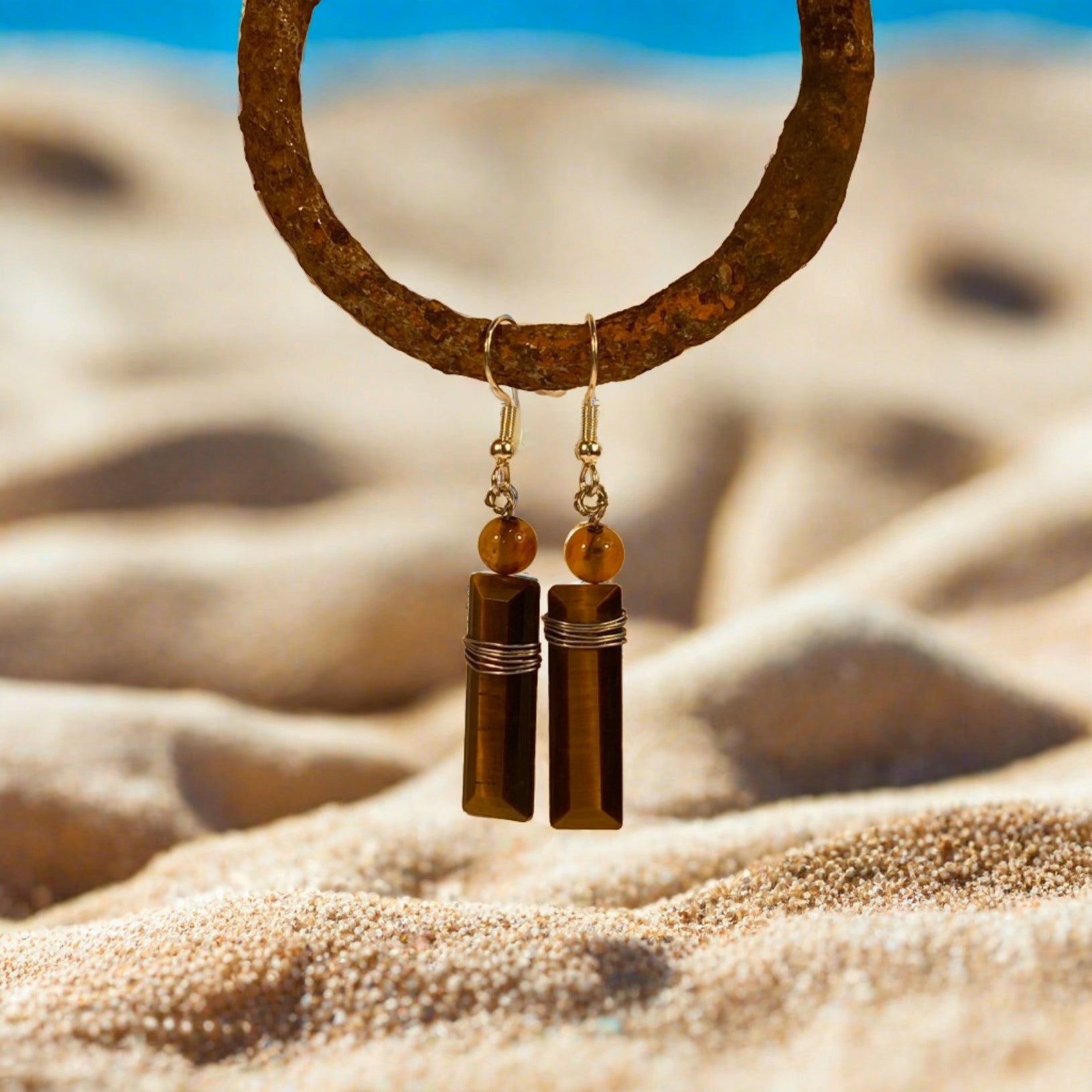 Ward off negative energies by wearing these Tiger Eye Earrings. Stainless steel wire wrapped rectangular gemstones and glass beads, on stainless steel fish hook earrings. We offer these earrings in Sodalite (blue), Rose Quartz (pink and red), Aventurine (Green, Coral, Grey), Moss Agate (Grey-Green with striations), and Amazonite (Bluish green) at https://www.jwhdesigns.ca/.